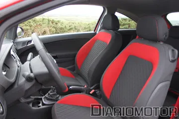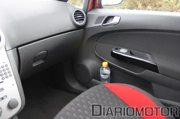 El Opel Corsa GSi sólo está disponible con tres puertas. Abrimos la puerta delantera y nos sentamos en el asiento del conductor, como todos los demás, tapizado en tela. Con flancos pronunciados de color rojo en banqueta y respaldo, sujetan muy bien el cuerpo. Estos asientos no tienen regulación lumbar, pero al tener un mullido duro no se echan de menos en viajes largos. Son regulables en altura, pero a pesar de ello el Opel Corsa tiene una posición de conducción relativamente alta.