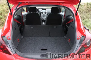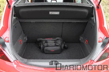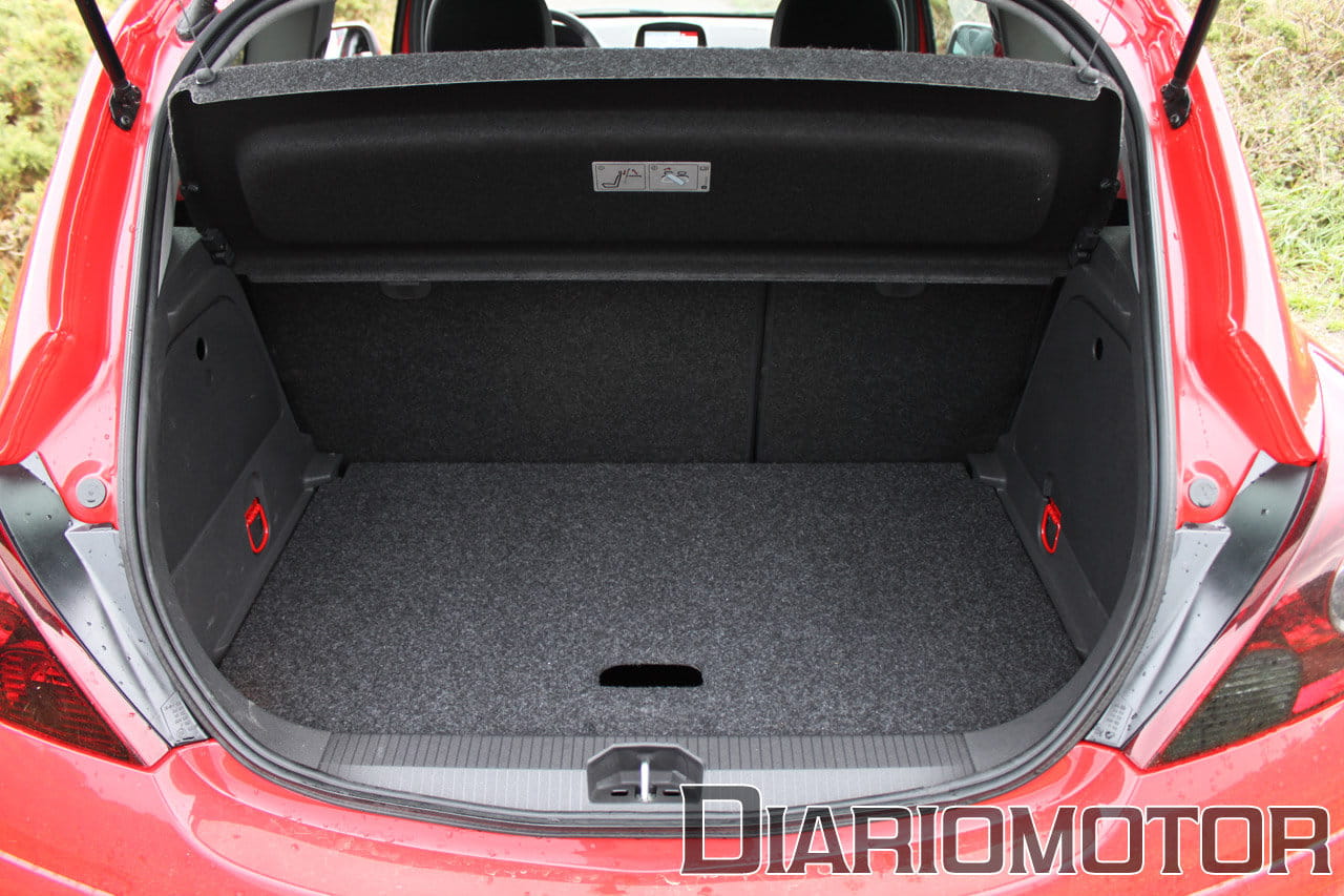 Uno de los aspectos en los que destaca el Opel Corsa GSi es en su maletero. Cubica 285 litros, que ya es una cifra muy buena para un utilitario. El maletero tiene formas perfectamente regulares, además de ganchos para colgar objetos y dos fijaciones para atar cinchas o similares. La sorpresa está en el piso, denominado FlexFloor. Es una bandeja extraible que se puede colocar en una posición superior, enrasando la boca de carga con el piso de carga, y por tanto facilitando la carga y descarga.
