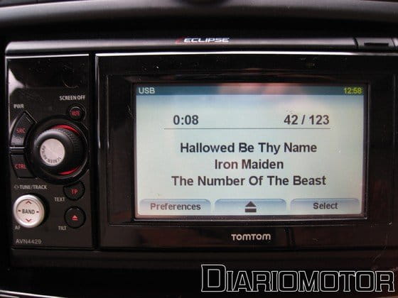- Equipo de infotainment TomTom Eclipse: es de serie en toda la gama. Tiene un navegador táctil TomTom, extraíble para evitar robos. No hay queja alguna del GPS, es de los más intuitivos y cómodos del mercado, de los que mejores indicaciones da, en mi opinión. A través de su pantalla táctil también accedemos a la radio o los medios externos que tengamos, por ejemplo un pen drive USB. Para cambiar de modo hay que pulsar botones físicos en la carcasa del sistema. En el equipo se muestran las imágenes de la cámara de marcha atrás. Integra manos libres Bluetooth. Tiene cuatro altavoces.