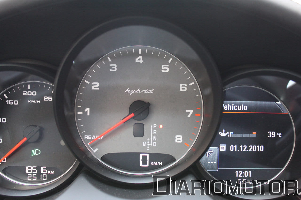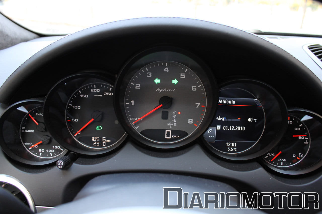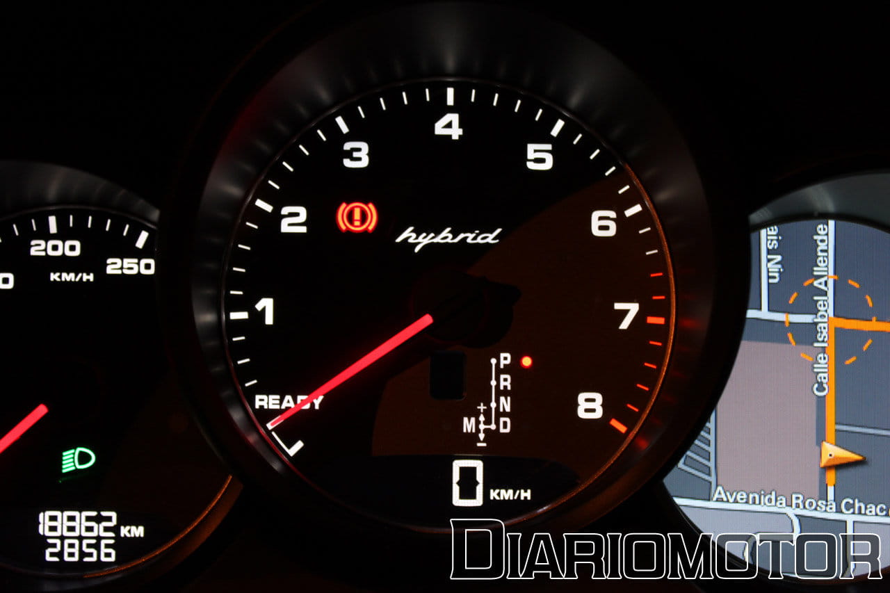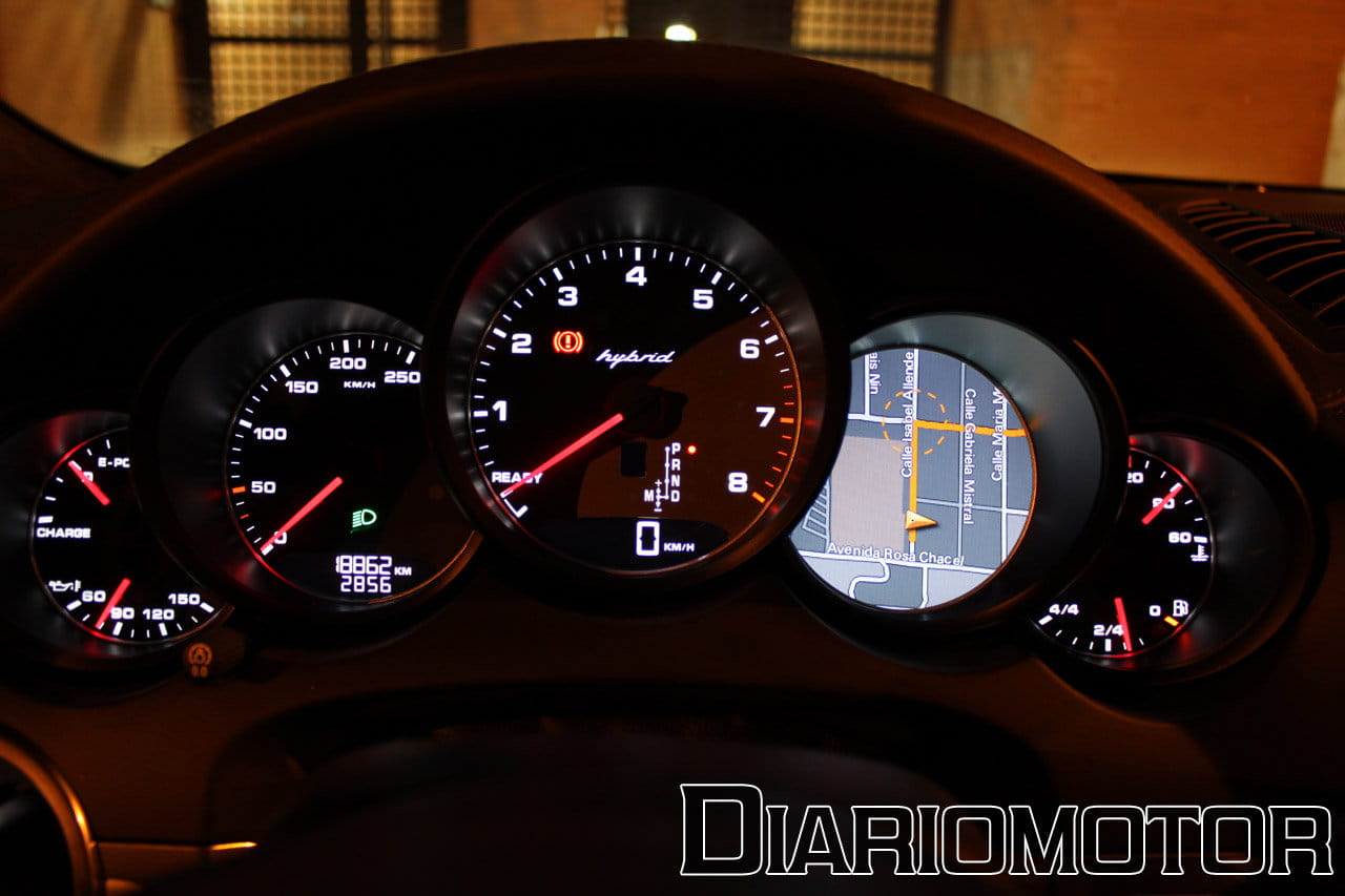 La instrumentación también está en línea con los demás Porsche, aunque nuestro vehículo de pruebas sea un híbrido. El cuentarrevoluciones está en el centro, flanqueado a su izquierda por un velocímetro con una escala bastante radical. Sería poco práctico si ni pudiésemos ver la velocidad a la que circulamos en un pequeño cuentakilómetros digital bajo el reloj central. A su izquierda, se vigila la temperatura del aceite – gran detalle – y el estado de funcionamiento de la vertiente eléctrica del sistema híbrido.