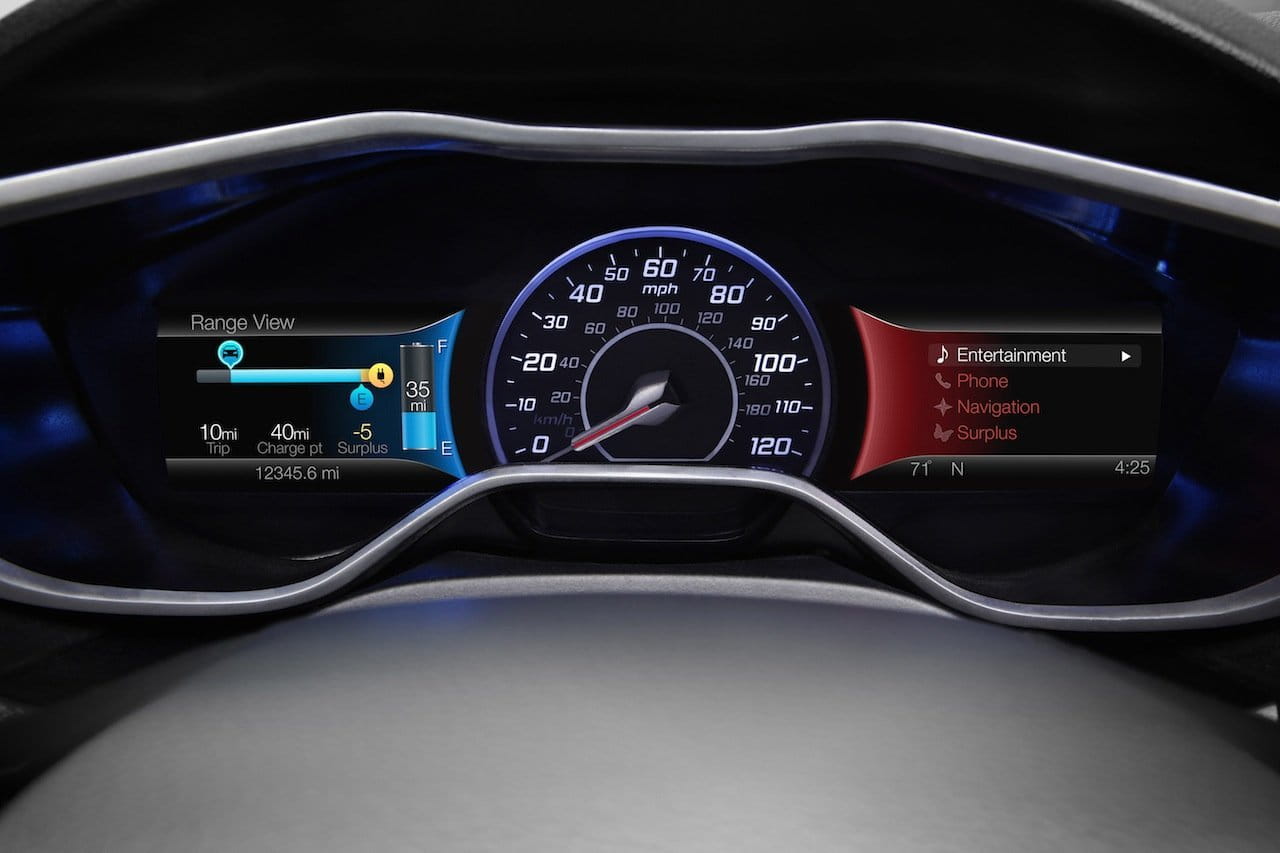 MyFord Touch permite configurar los instrumentos visibles en el panel del conductor que consta de un dial que marca la velocidad y dos pantallas LCD de 4.2”. La información básica incluye el estado de carga de la batería, la autonomía calculada o la distancia hasta el punto próximo de recarga eléctrica. La función MyView permite administrar el viaje usando el navegador, mostrar parámetros técnicos, etc.