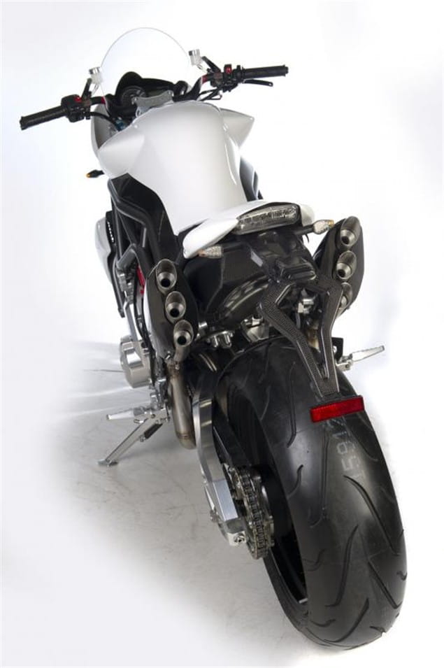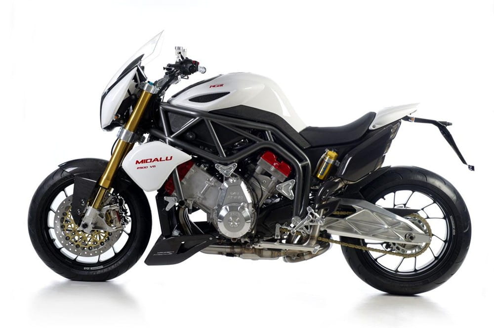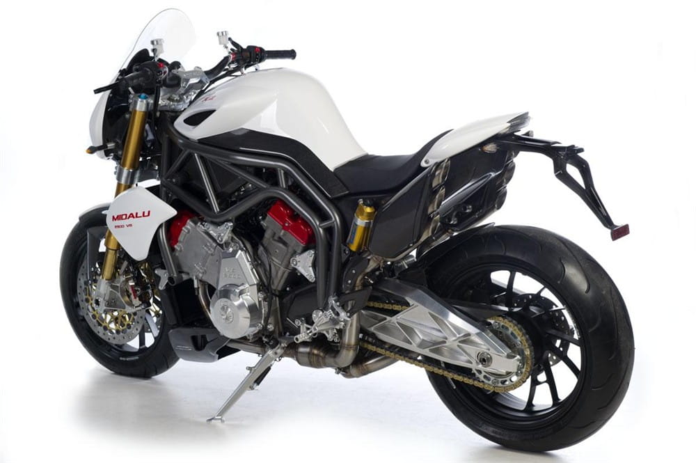 Aún así, esta naked de elevadísimas prestaciones pesa 270 kg. Si estos datos no aceleran vuestro pulso, el diseño espectacular de la Midalu debería hacerlo. Detalles como el ligero carenado en color blanco, el portamatrículas o los seis tubos de escape verticales podrían considerarse pura lujuria sobre dos ruedas. En cuanto al precio, me temo que no será nada barata. No se ha publicado, pero FGR sólo planea construir de manera artesanal seis unidades al año.