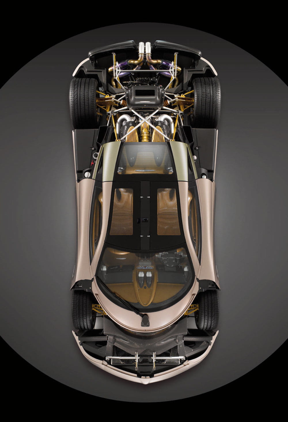 El Pagani Huayra ha crecido ligeramente respecto al Zonda. Es ahora 17 centímetros más largo y la distancia entre ejes ha crecido 70 mm. Por su parte la posición del habitáculo se ha retrasado 40 mm y ahora cuenta más espacio para el conductor y su acompañante. El ahorro de peso también ha sido una prioridad, en vacío homologa en báscula apenas 1.350 kg, con una distribución de pesos del 44% delante y el 56% detrás. Dispone además de un depósito de combustible de 85 litros.