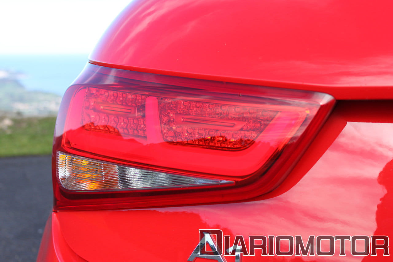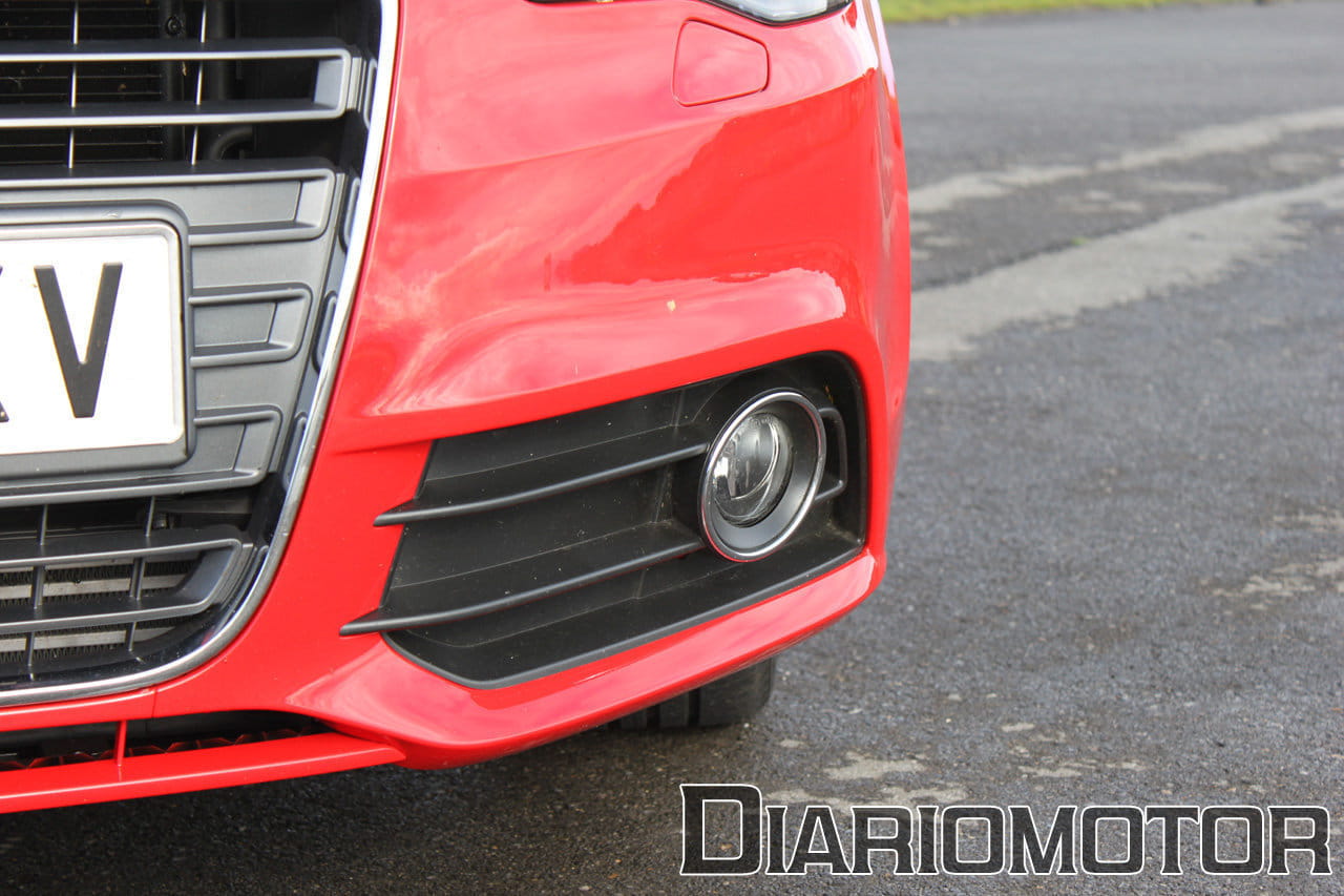 El frontal porta la típica calandra de borde cromado con los cuatro aros enmarcados, tomando protagonismo. Los faros delanteros tienen una forma bastante característica, con un párpado compuesto por una fina banda de LEDs diurnos. El efecto de estas luces es similar al de otros Audi, pero en lugar de distinguirse claramente las bombillas LED lo que vemos es una luz de intensidad continua, visible incluso a contraluz. Su intensidad disminuye cuando encendemos los faros de xenón que equipa nuestra unidad.