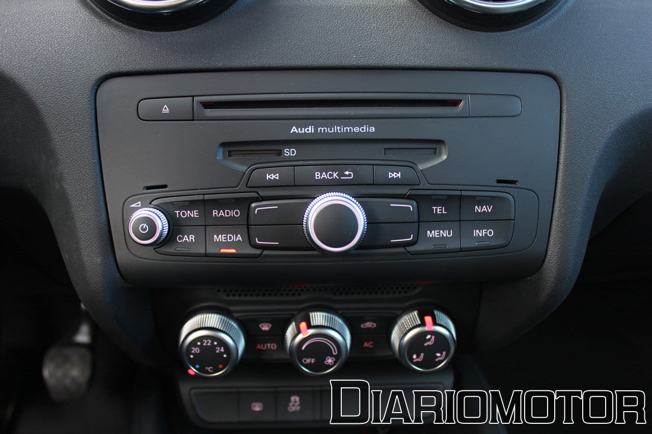 En las puertas también hay un hueco amplio para una botella de agua de litro y medio, con espacio restante para documentación, mapas o revistas. La conexión USB con el equipo de sonido de nuestra unidad no era posible, por lo que tuvimos que recurrir a un CD con archivos en MP3. Sí lleva conexión auxiliar de serie, pero no nos resultaba útil. La palanca de cambios del Audi A1 queda a mano, y tiene el mismo tacto que la de un Volkswagen Golf de sexta generación, con un diseño prácticamente idéntico.