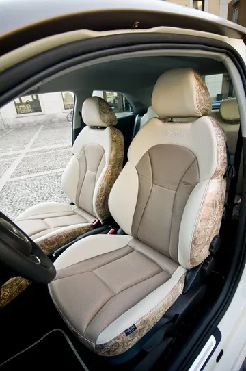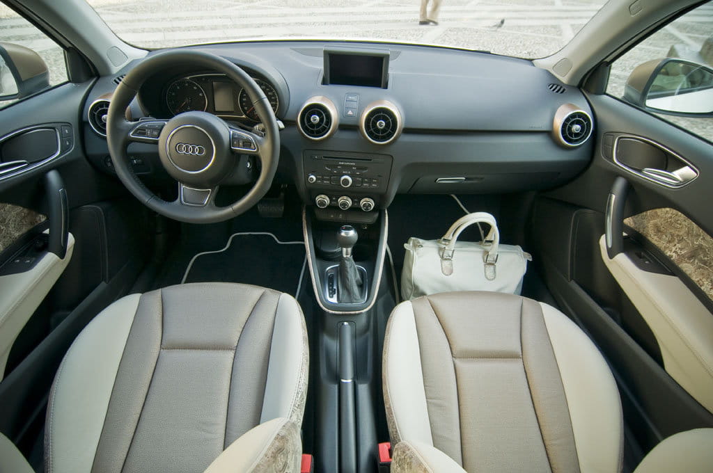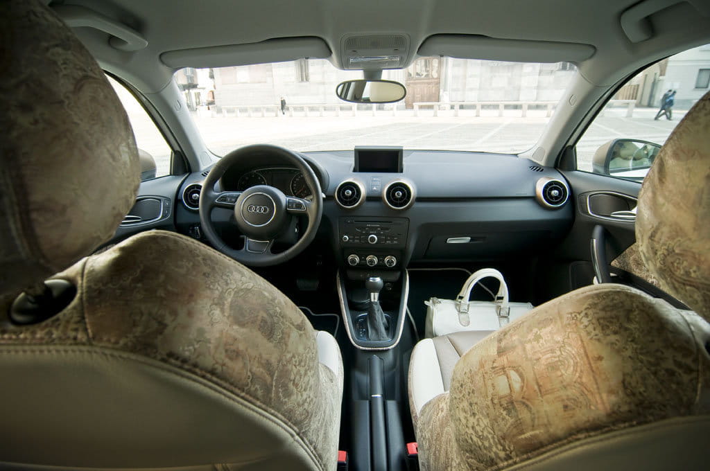 El Audi A1 Goldie es de color blanco de forma predominante pero el techo y los pilares están coloreados en tinta opaca de oro (en este no es oro de verdad) al igual que los centros de las llantas que por otra parte no son especiales para la ocasión. En el interior es donde está el mayor jugo del trabajo de Aznom: los asientos entremezclan la piel blanca con unos estampados de de Damasco y las salidas de aire tienen también un tono dorado.