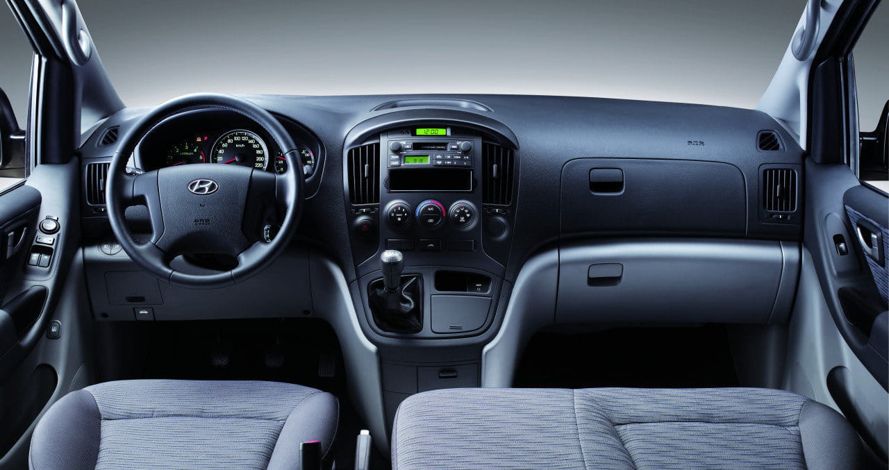Absolutamente todos los Hyundai H1 traen consigo de serie airbags frontales, control de estabilidad, aire acondicionado, radio CD con lectura de archivos MP3 y entrada auxiliar de sonido, reposacabezas regulables en altura, etc. Tanto si es la de tres como la de seis puestos la H-1 incluye una pared de acero con ventanilla de cristal que actúa de separador entre los pasajeros y la carga.