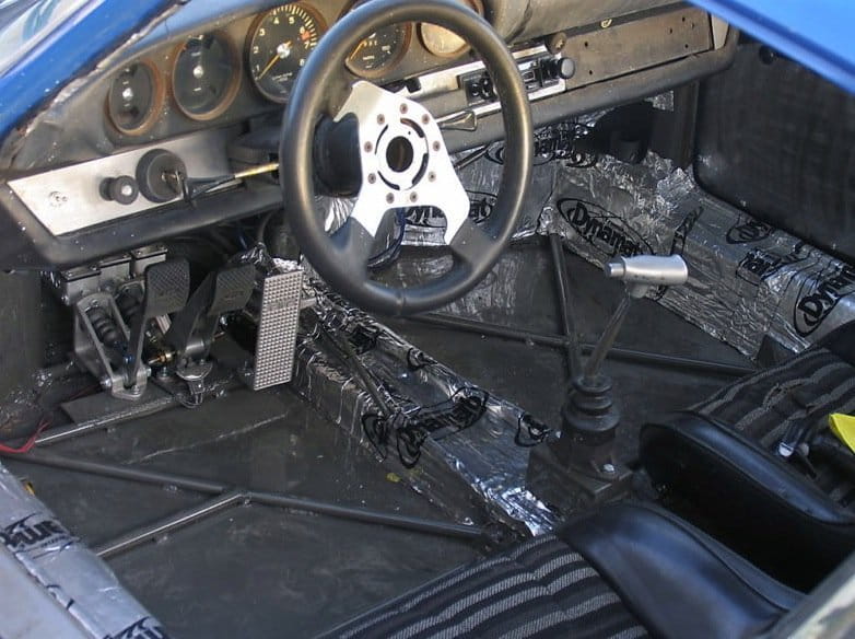 Por si no teníamos suficiente con todas estas modificaciones, démosle un vistazo a la carrocería. El acabado de pintura azul con desperfectos propios de la edad de un deportivo cuarentón como éste no se deben al paso del tiempo, sino a un trabajo de pintura específico y posterior a su preparación para darle un toque vintage y fingir que mantiene su pintura original. En el habitáculo también hubo modificaciones para sustituir algunos de los paneles originales y mejorar su insonorización.
