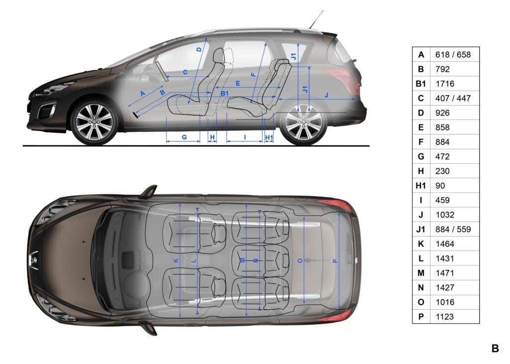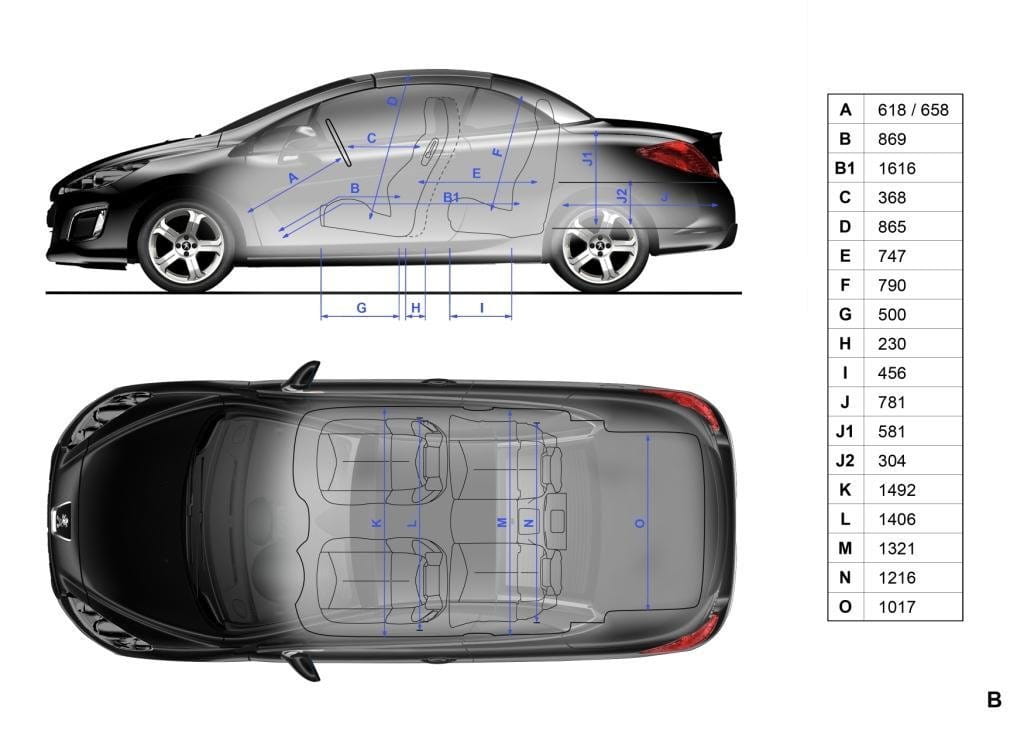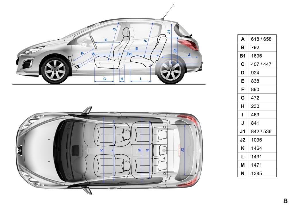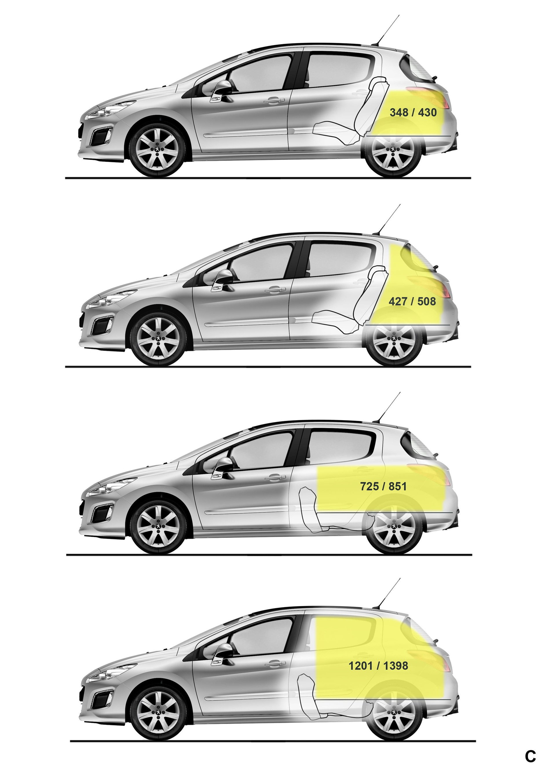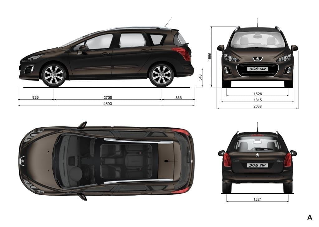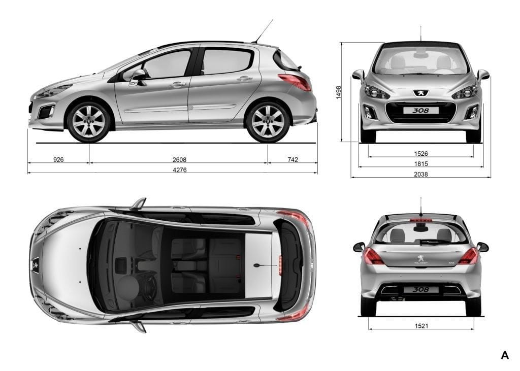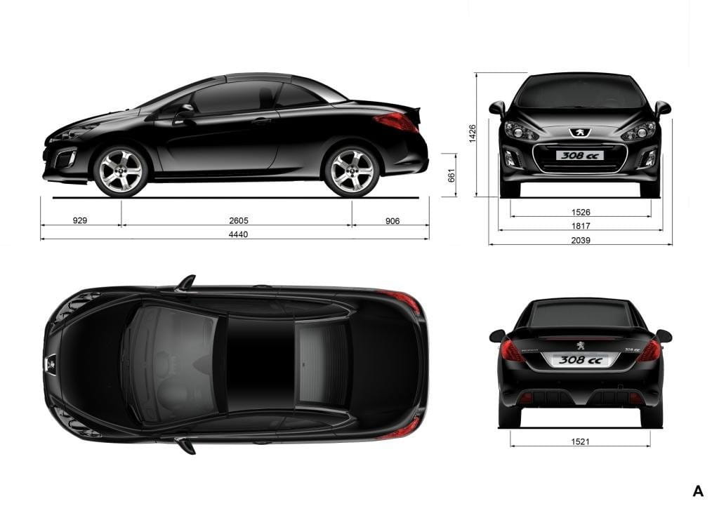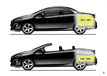 Las proporciones del Peugeot 308 siguen siendo exactamente las mismas en los tres sabores disponibles: 4.28×1.82×1.5 metros en el cinco puertas, 4.5×1.82×1.56 metros en el SW y 4.44×1.82×1.43 metros en el CC (longitud, anchura y altura respectivamente). Por la misma razón los espacios interiores se conservan al igual que los volúmenes de sus maleteros: 348, 508 y 403 litros (con la capota desplegada, sólo 226 litros con ella cerrada).