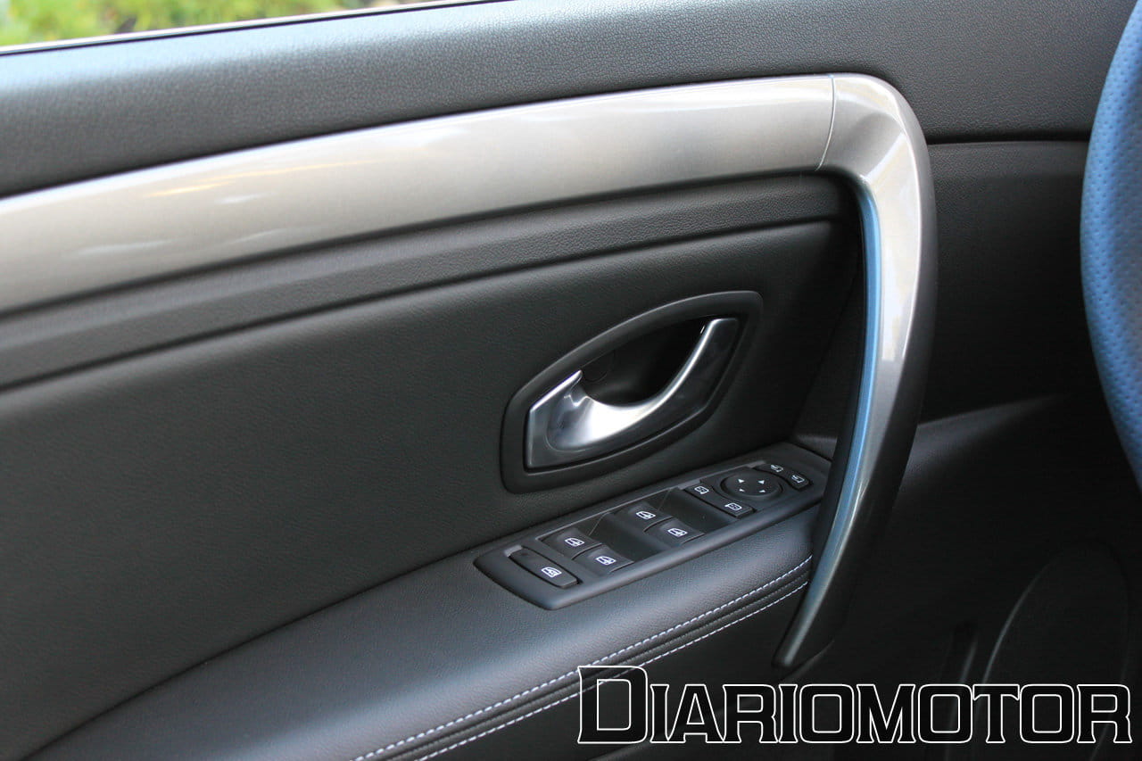 Los asientos combinan Alcantara para respaldo y banqueta, cuero para los flancos. La Alcantara era de color azul claro. Los flancos son bastante blandos, pero el asiento sujeta bien el cuerpo, tiene ajuste lumbar y unas dimensiones correctas para personas adultas de buena talla. Los pedales son de aluminio y es aquí donde terminan los toques deportivos. Los tiradores cromados de las puertas, los acentos plateados de los aireadores o los asideros son comunes a otras versiones del Laguna.