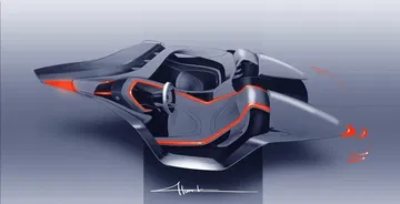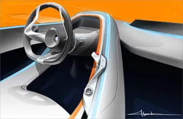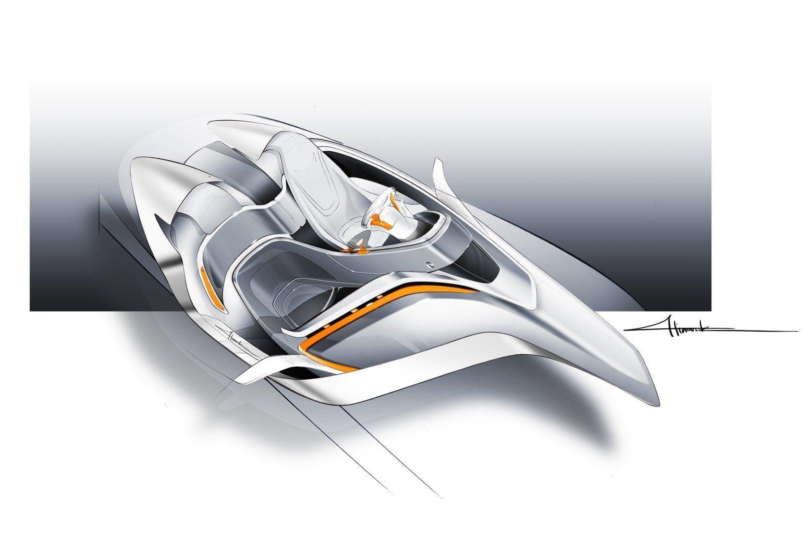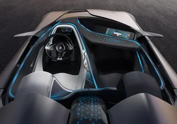 Y si estás mirando su futurista y minimalista interior, con varios ambientes en colores distintos y que únicamente cuenta con los mínimos elementos imprescindibles, te preguntarás, ¿dónde está la información? Aquí no hay un cuadro de instrumentos al uso, sino que todos los datos (velocidad, navegador, ordenador de abordo, etc…) se muestran en un head-up display tridimensional, proyectando la información mediante haces de luz.