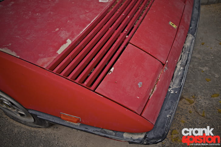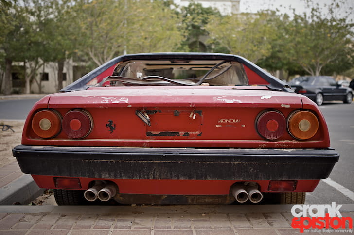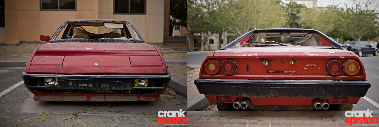 Aunque nunca ha sido el Ferrari más querido o venerado, es auténticamente triste ver el estado en el que se encuentra. Según un residente de la zona, el coche es propiedad de una mujer que lo aparcó por última vez en 2007. Resulta chocante el vandalismo que ha sufrido, pues los coches aunque lleven años a la intemperie no suelen tocarse en absoluto. Un ladrillo se ha usado para romper el parabrisas e incluso se ha intentado forzar el eje trasero para robar una de las llantas, sin éxito.