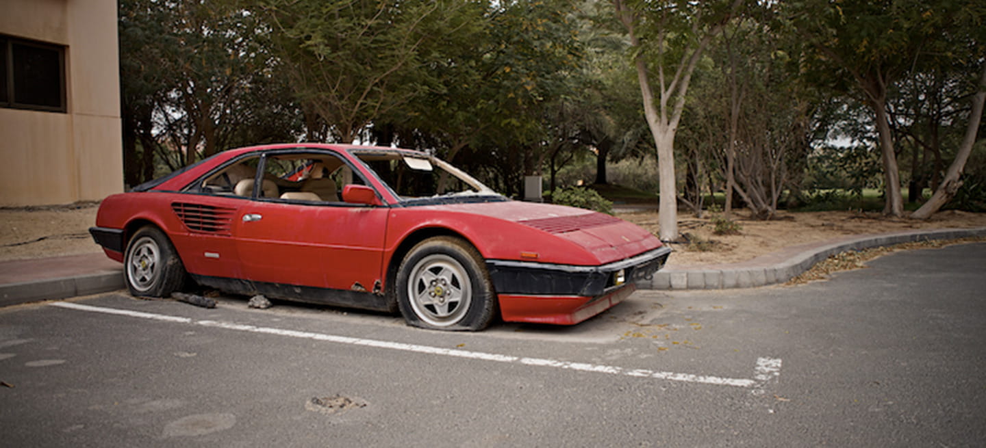 Paraíso de la especulación, Dubai está empezando a temblar sobre sus pies de arena fruto de la crisis financiera global. El atractivo destino para suculentos proyectos urbanísticos e inversiones de riesgo ha perdido su estatus, y aunque sigue siendo uno de los lugares más ricos del mundo, no es la primera vez que vemos superdeportivos abandonados a su suerte en sus polvorientas y tórridas calles.