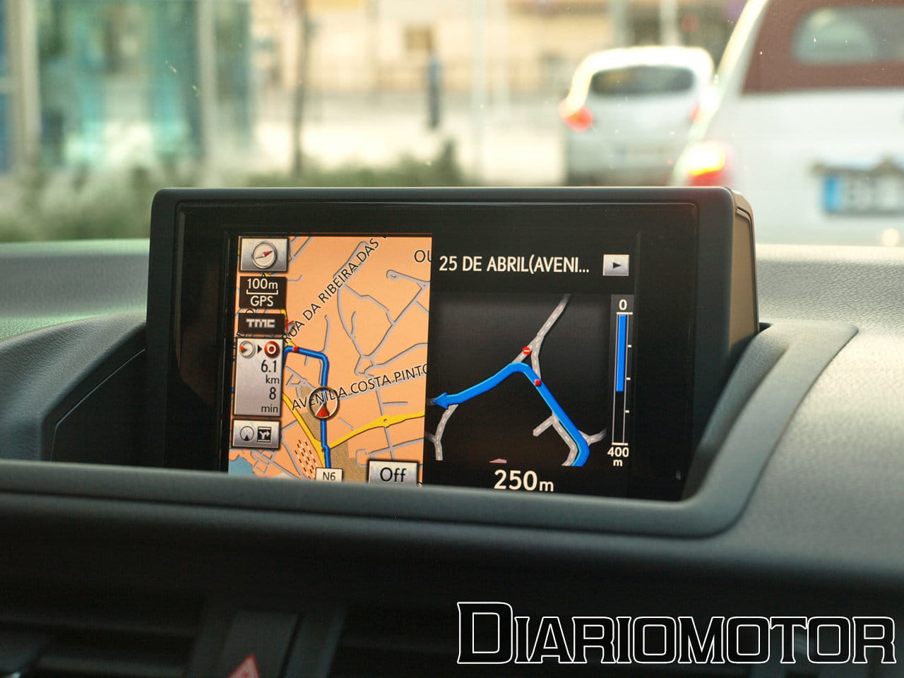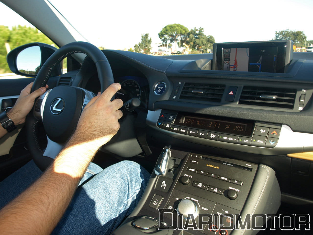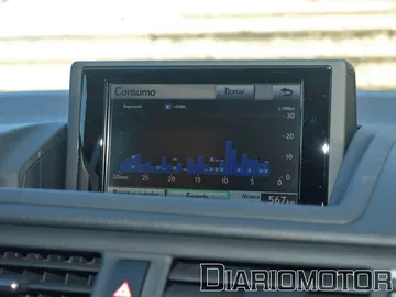 El navegador que es opcional en el Lexus CT 200h se muestra en una pantalla que pivota automáticamente, de forma regulable mediante un botón, sobre el centro de salpicadero. Esta pantalla muestra todo el apartado multimedia que comprende el manejo de la radio, la música de los CDs o de las conexiones externas (mediante Bluetooth, USB y minijack), de parte de la información de uso del tren híbrido y del propio navegador.