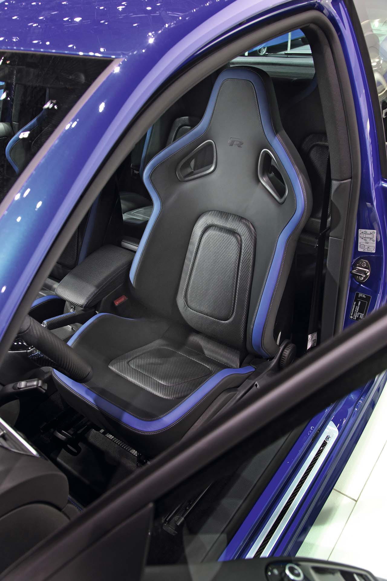 El Golf R grisáceo, concretamente de color “Gris espacial”, tiene retrovisores en fibra de carbono, llantas de aleación Talladega 19” y pinzas de frenos en naranja. Por dentro incluye Nappa negra con tonos de antracita, apliques en Piano Black (negro pulido brillante) y en naranja. Un Golf R azul “Aplomb Blue” ilumina a la última edición. Lleva llantas Glendale de 19” en plateado y también incluye una buena cantidad de fibra de carbono, por dentro y por fuera.