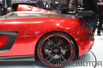 El agresivo kit de carrocería diseñado en túnel de viento está construido en plástico reforzado con fibra de carbono y la reducción de peso que conlleva se ha intentado distribuir de tal manera que no afecte a la dinámica del vehículo. Para mal, no para bien, se entiende. Las mismas tonalidades se extienden al habitáculo, dominado por el cuero rojo en volante, salpicadero y molduras. Se basa en un R8 Spyder manual y tiene detalles como los cinturones de seguridad también de color rojo.