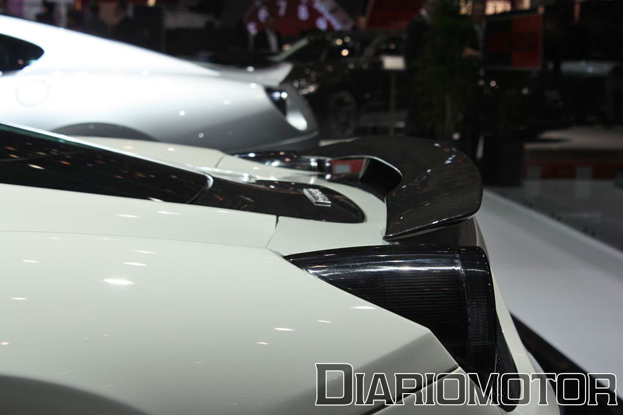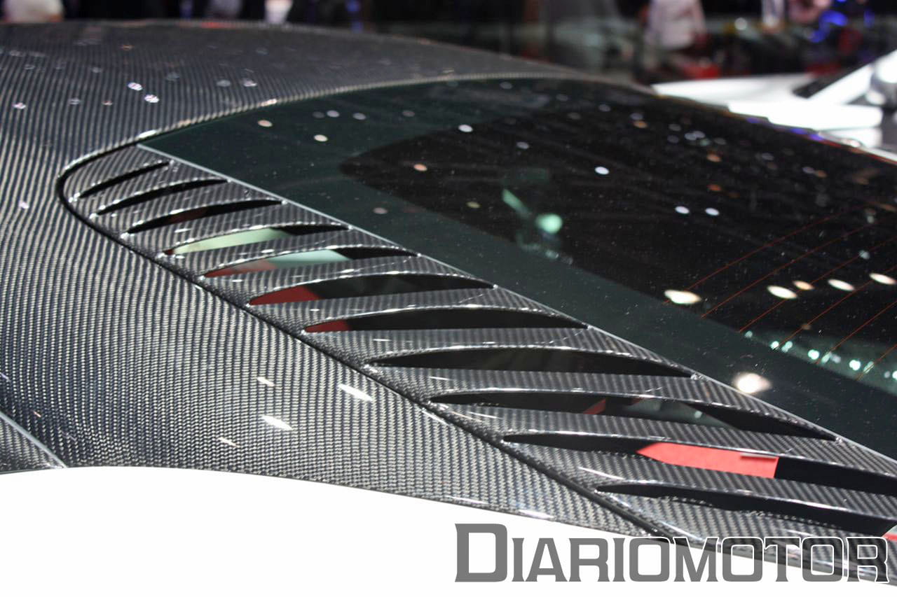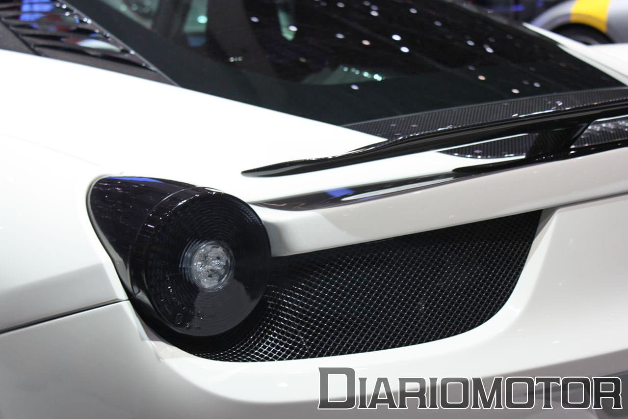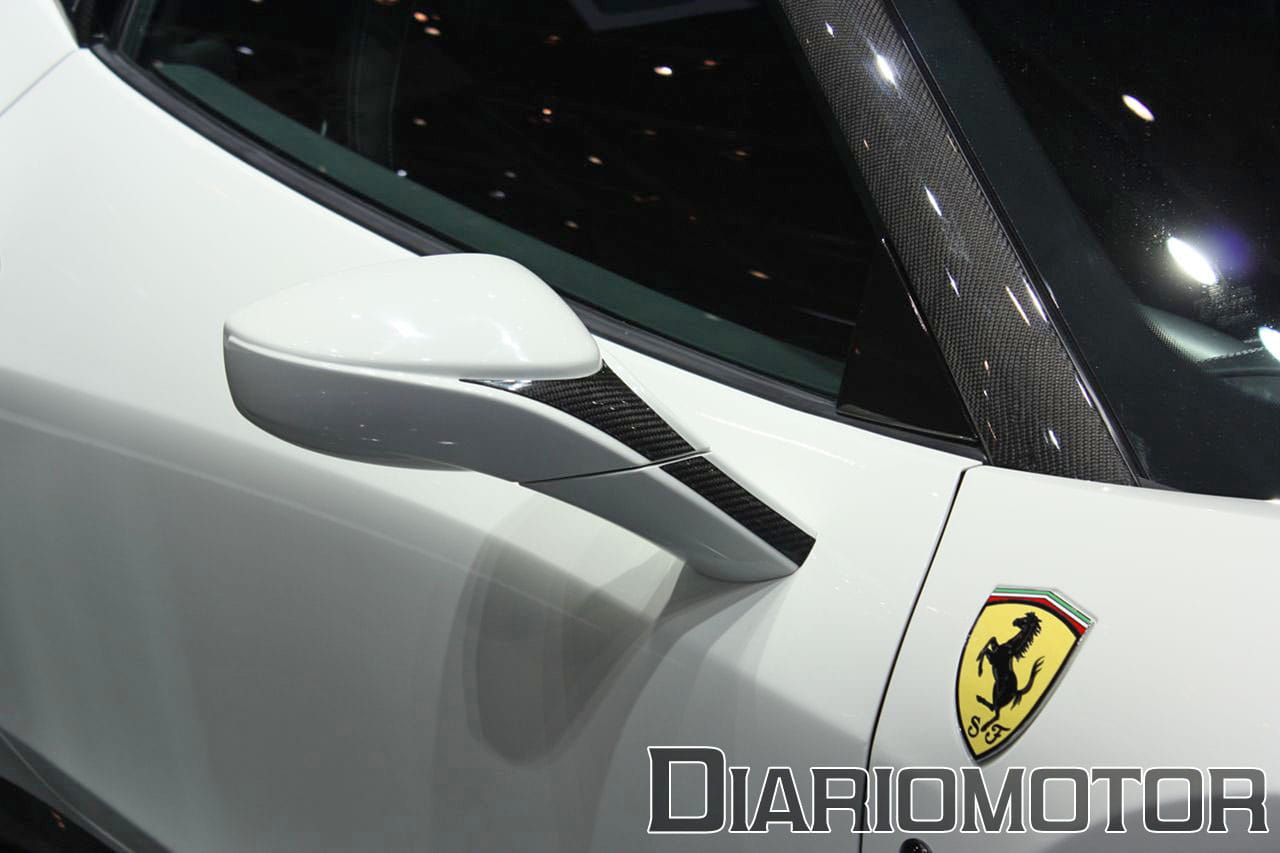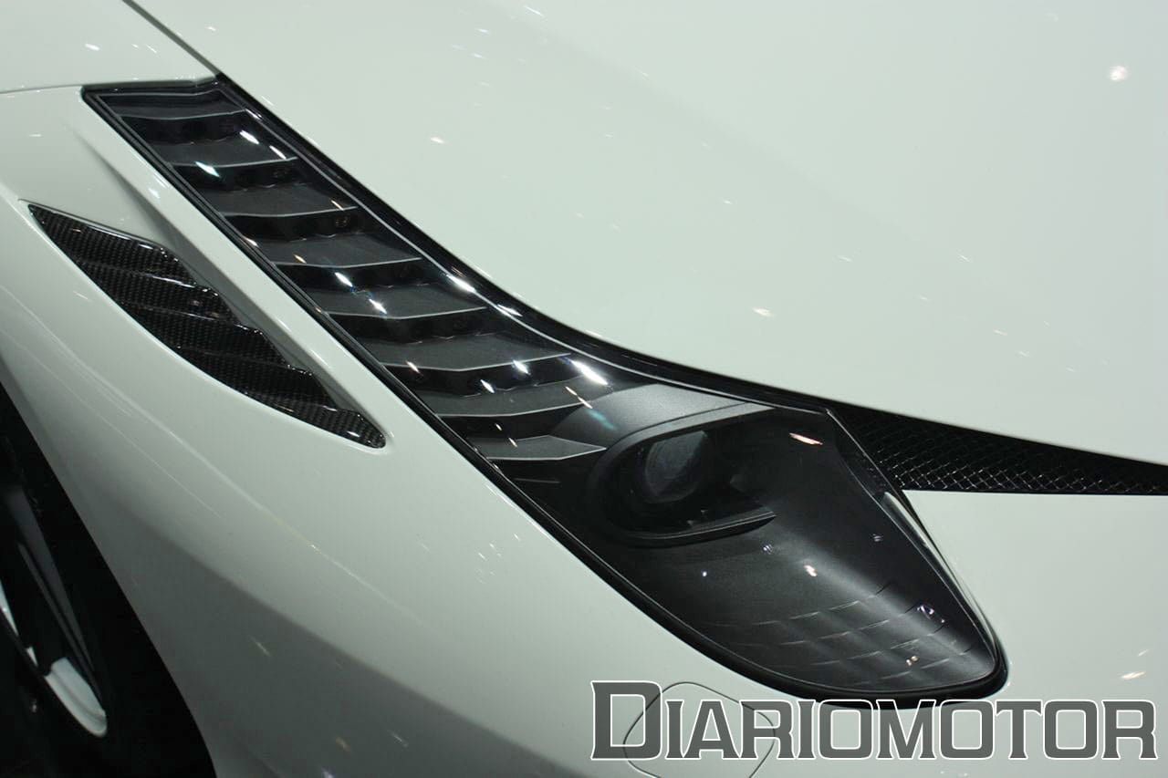 Acostumbrados a ver el coche en color rojo o amarillo, resulta extraño ver una unidad pintada de esta guisa: color blanco con numerosos detalles en negro. Sin embargo, resulta muy atrayente, quizá porque esta combinación nunca falla en cuanto a captar la atención. El blanco contrasta con el color negro que nos encontramos en llantas o faros, y las partes en fibra de carbono (techo, retrovisores, alerón, etc…).