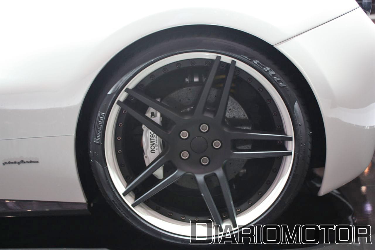 Las llantas merecen especial atención, no tanto por el labio exterior pintado en color blanco sino por lo descomunal de su tamaño. Resulta difícil encontrarse cara a cara con llantas de 22 pulgadas (21 pulgadas en el eje delantero). En la anterior fotografía podemos ver un detalle de una de las llantas, calzada sobre unos neumáticos Pirelli P Zero y dejando ver a su través las nuevas pinzas de freno instaladas por Novitec, que muerden unos discos de freno cerámicos.