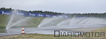 En la pista de pruebas del ADAC en Linthe, muy cerca de Berlín, pudimos comprobar in situ otro de los métodos que se emplean para contrastar la distancia de frenado en mojado entre vehículos. Para ello se emplea un tramo de asfalto sobre el que se conectan unos aspersores de agua.
