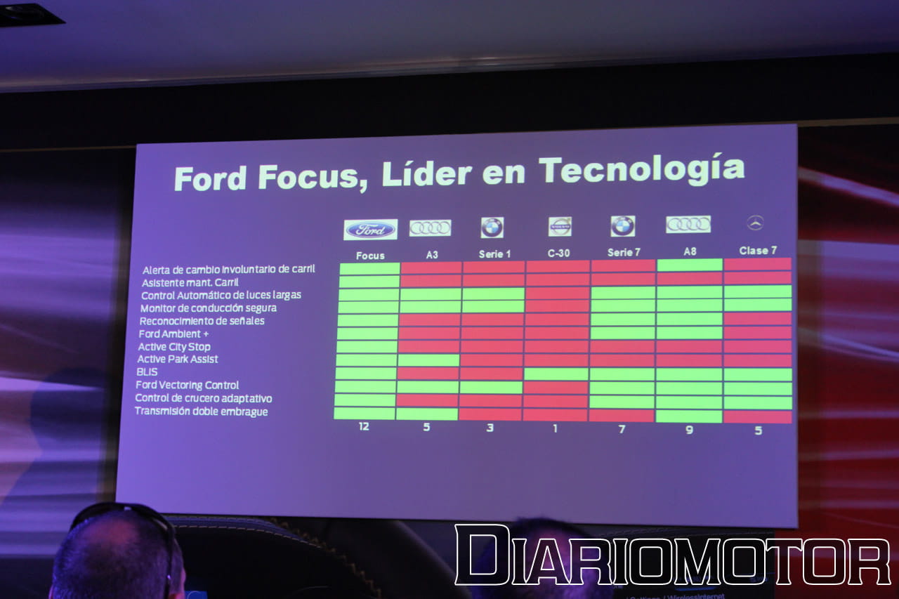 El nuevo Ford Focus tiene un marcado componente tecnológico, que lo diferenciará mucho de la competencia. Varios esquemas que nos han mostrado demuestran que tiene más tecnologías de apoyo a la conducción, dinámica y seguridad que por ejemplo un BMW Serie 7. Lo que se ha fomentado es un acercamiento al público general de estas tecnologías antes reservadas a la alta gama, algunas de serie y otras disponibles en paquetes opcionales a un coste razonable y asumible para muchos clientes.