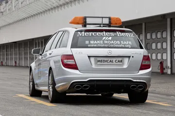 A su volante se encuentra el piloto sudafricano Alan van de Merwe, acompañado por el doctor Gary Hartstein, médico oficial de la FIA desde hace décadas. Sentados en bacquéts con cinturones de seis puntos, también se sienta en los asientos traseros a dos medicos de clínicas locales, seleccionados por la organización de las carreras. El amplio maletero de 485 litros del C 63 AMG Estate es el lugar para el equipamiento médico, medicamentos, calmantes, un desfibrilador o respiradores artificiales.