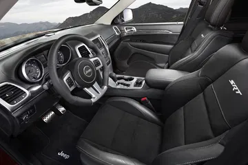 Cuando se abren las puertas del Jeep Grand Cherokee SRT8 no parece que estemos mirando al interior de un todoterreno, sino a un deportivo más del mercado. Guarda detalles de sus hermanos pequeños, pero adopta otros tantos de la competición en circuito más pura. Por ejemplo, el volante achatado en su parte baja o las manetas del cambio en el volante. O los detalles en fibra de carbono del salpicadero.