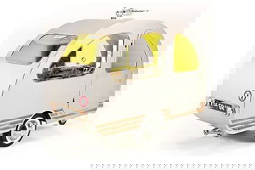 No hay más que ver en la imagen inicial la proporción entre el tamaño de la persona y el de la propia caravana para darse cuenta de lo minúscula que es. Tan sólo mide 2 metros de largo y 0,75 metros de ancho, un tamaño muy reducido pero que permite salir de un apuro. Así, en el interior nos podemos encontrar una cama (individual, obviamente), una televisión de 19 pulgadas, una batería auxiliar, radio despertador e incluso un juego de café con cafetera incluida.