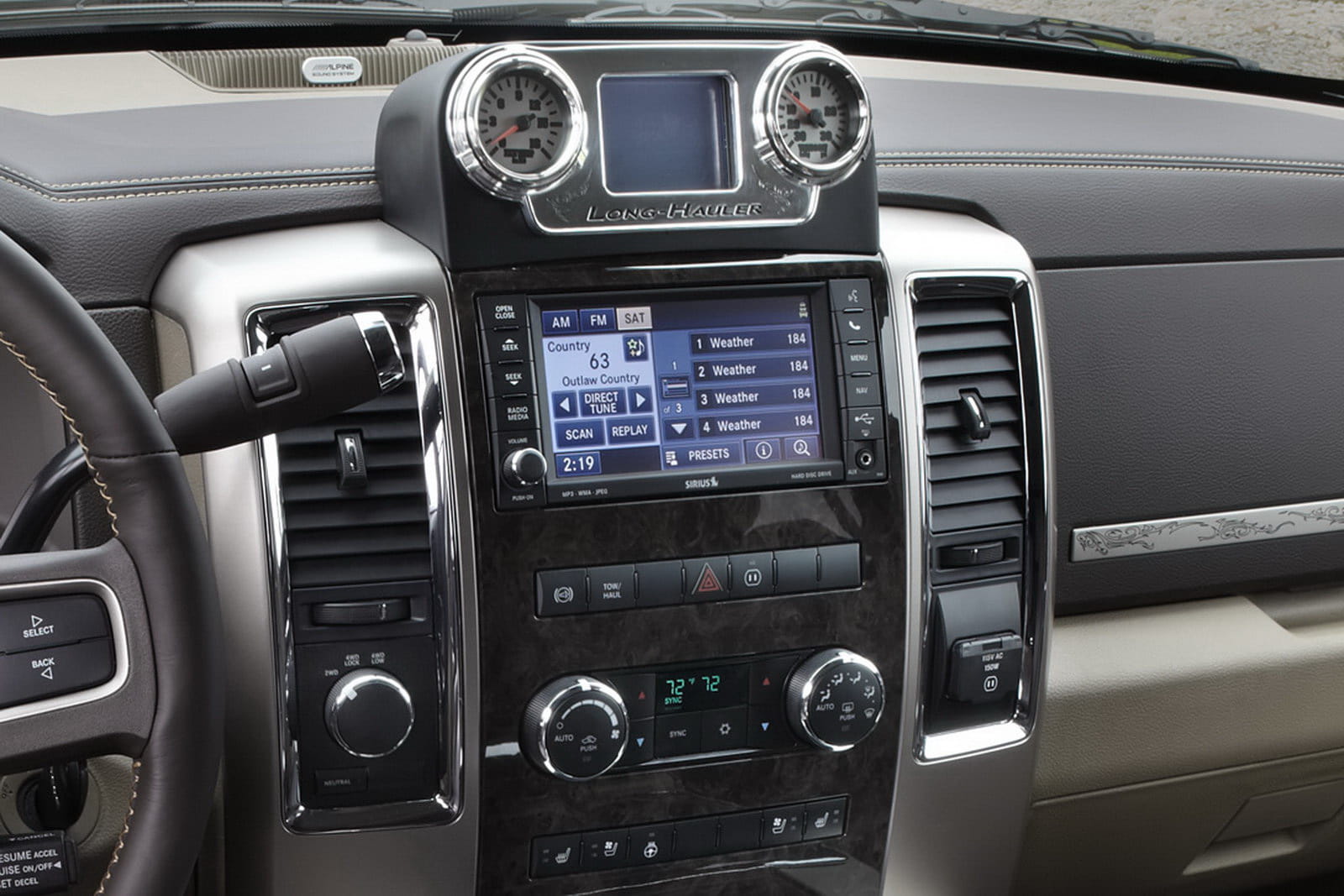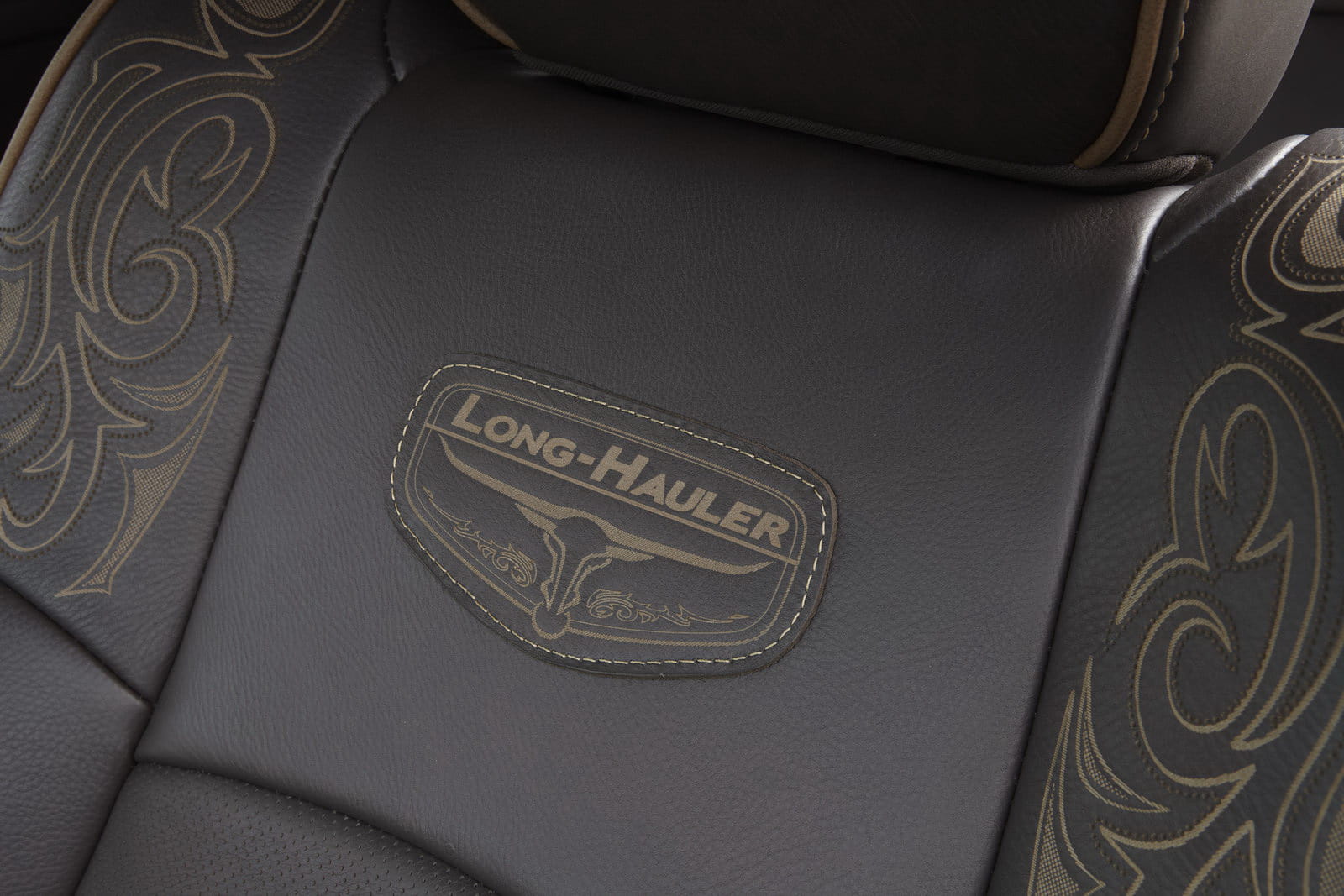 Las llantas de 19,5 pulgadas incluyen un doble juego trasero, digno de una auténtica cabeza tractora, de ahí que estas versiones sean denominadas dually. El habitáculo del Ram Long-Hauler Concept está customizado con asientos de cuero y una instrumentación con detalles “sureños” que harán las delicias de los habitantes del gran estado de Texas. Bromas aparte, tiene un completo equipo de infotainment y una instrumentación muy completa orientada al control de la carga.