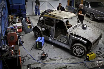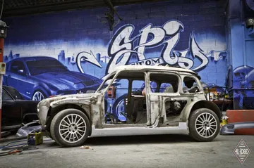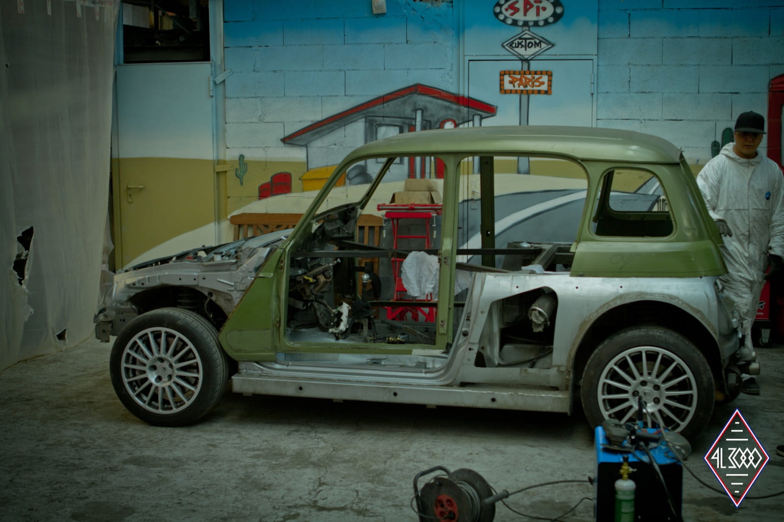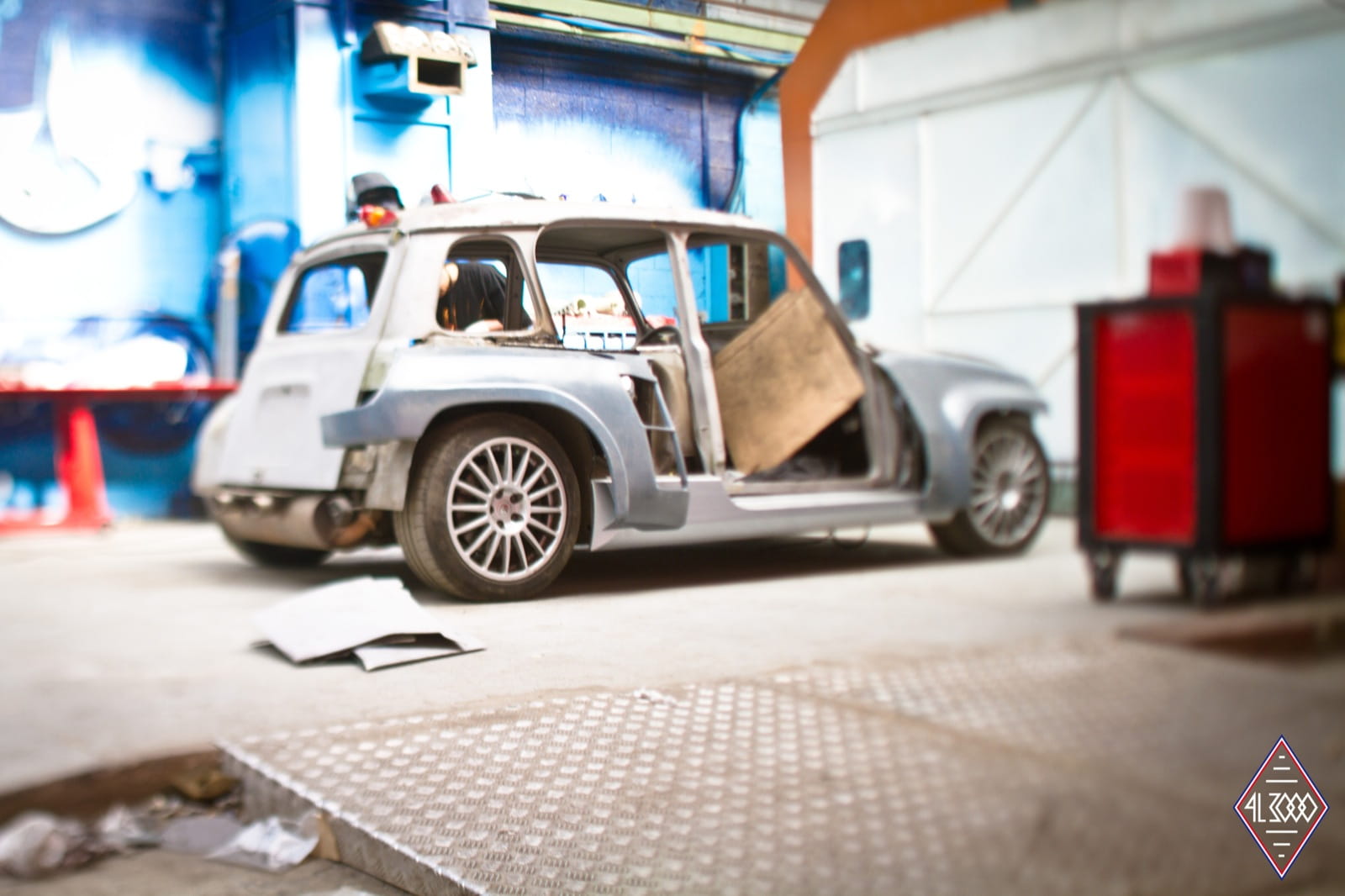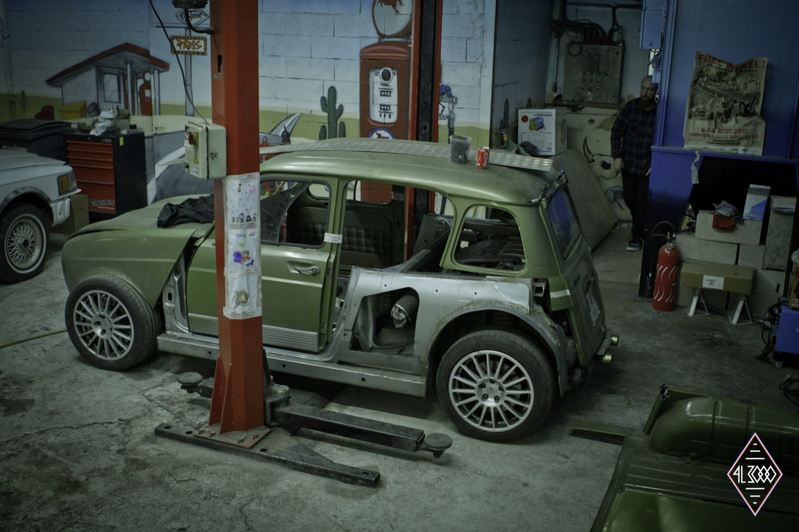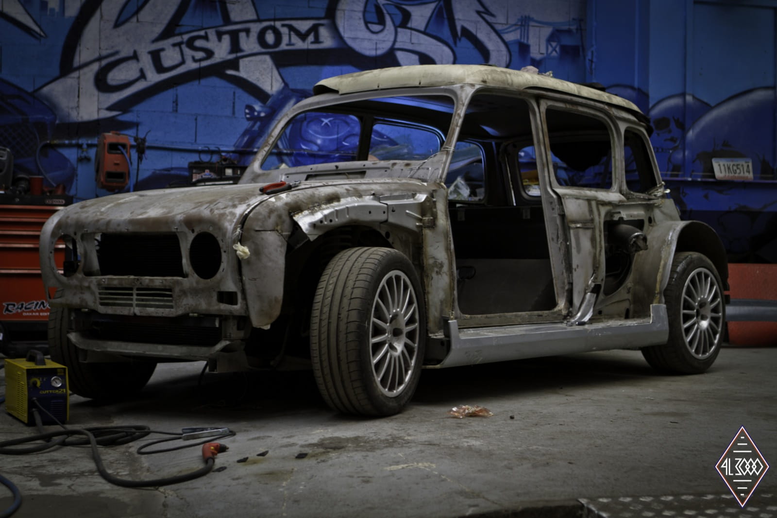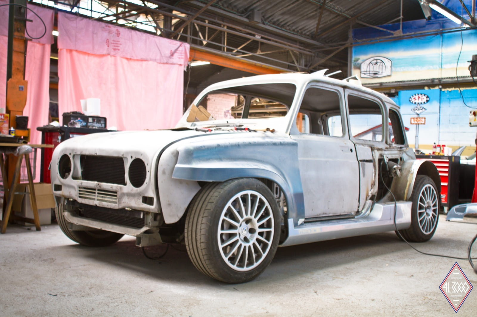 En su día se comercializaron más de 8 millones de unidades del polivalente Renault 4. Hoy en día la carrocería de uno de estos clásicos ha sido desmontada, ensanchada y ajustada al chasis de uno de los compactos más radicales de todos los tiempos: el Renault Clio V6. En definitiva tenemos un Renault 4 brutalizado con el motor central trasero de seis cilindros en V heredado del Clio V6 y sus rabiosos 225 CV de potencia.