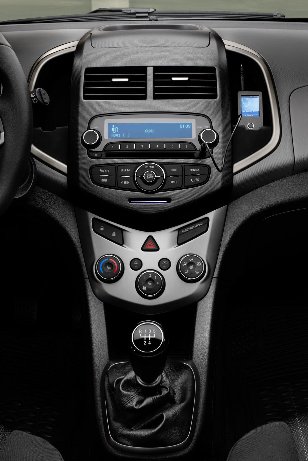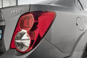 En el interior del Chevrolet Aveo, encontramos una instrumentación inspirada en el mundo de las motos, con un velocímetro digital en una pantalla LCD y un tacómetro de aguja. La iluminación es de color azul, y en la consola central encontramos el equipo de sonido (con cuatro o seis altavoces) y el sistema de climatización.
