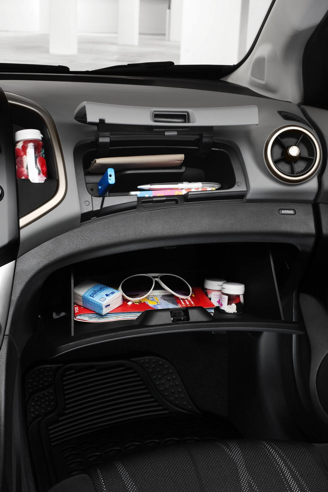 El acompañante cuenta con guantera doble: la superior incluye además una toma auxiliar un puerto USB, para conectar dispositivos de sonido. La terminación del salpicadero puede ir a juego con el tapizado de los asientos, diferente según cada nivel de acabado.
