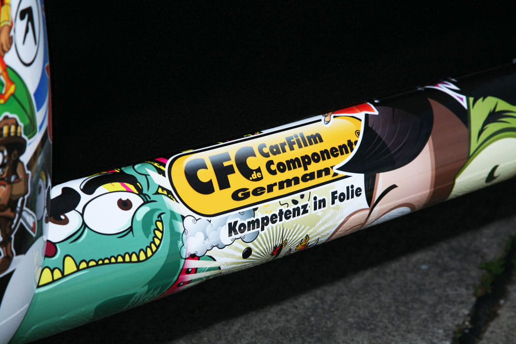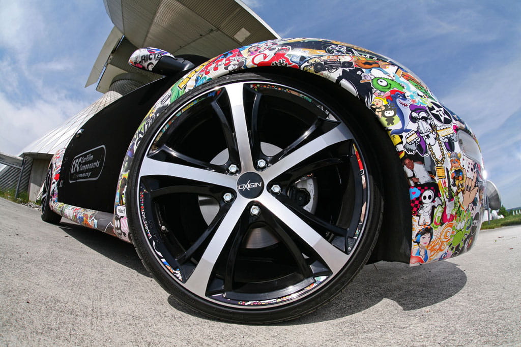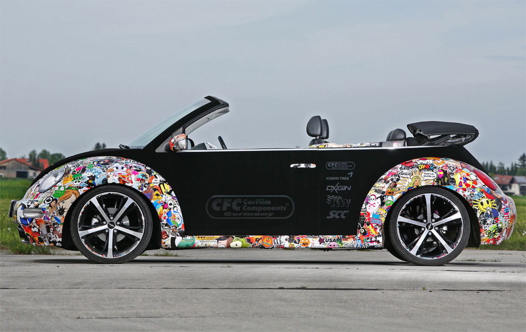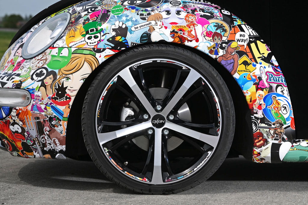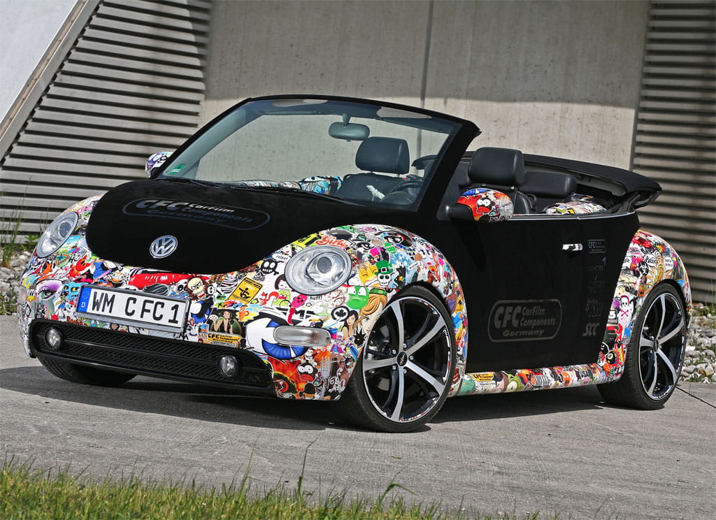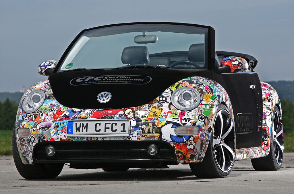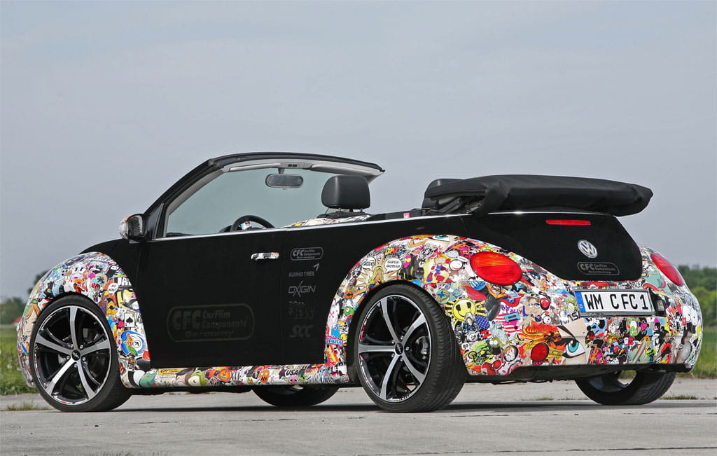 Volviendo al tema que nos ocupa, con esta personalización exterior de CarFilmComponents el conductor (o conductora) de un New Beetle se aseguraría de no pasar desapercibido, aunque parezca más apropiada para shows, exhibiciones o usos publicitarios a causa de su espectacularidad. CFC comecializa este tipo de pegatinas para el New Beetle que cubren toda la zona que dibujan los pasos de rueda del vehículo, incluyendo además los paragolpes delantero y trasero así como los faldones laterales.