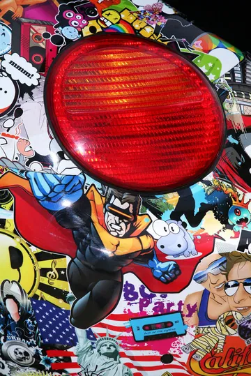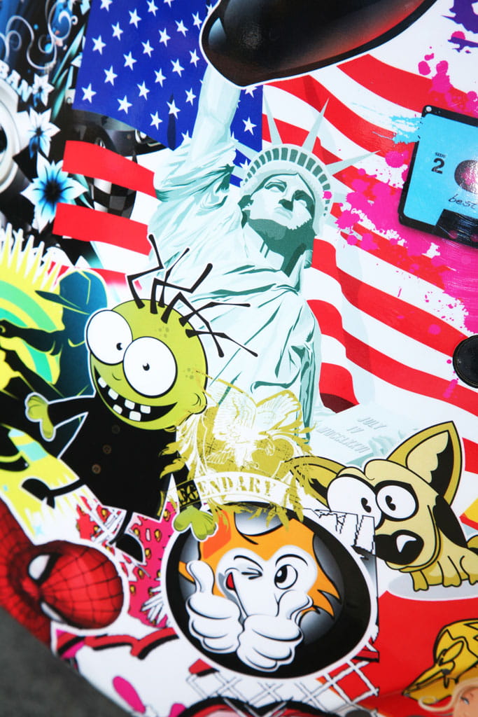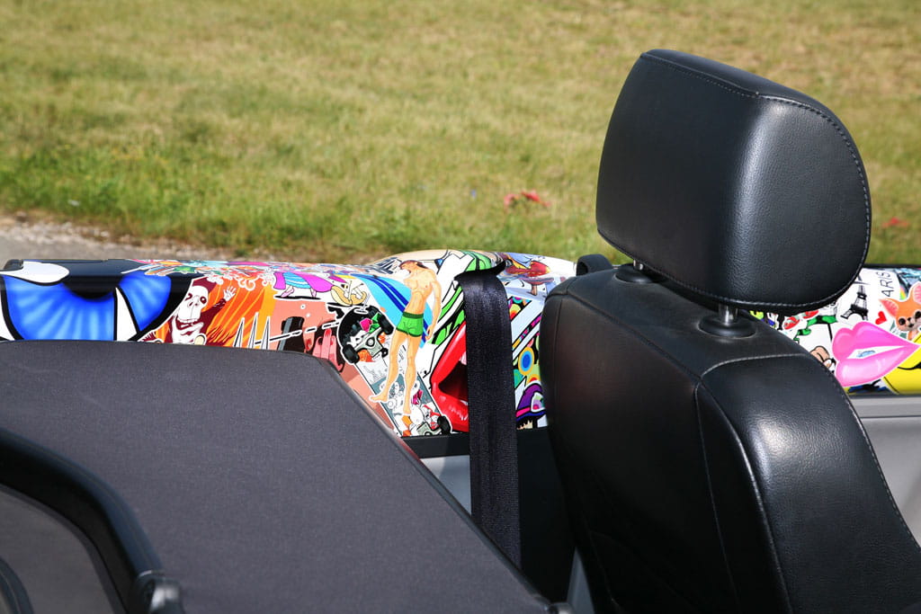 Precisamente en el movimiento hippie algunos de los vehículos más populares y típicos eran sin duda los Volkswagen Escarabajo o las Volkswagen Transporter T1 y T2. Seguro que en vuestra memoria están estos típicos Volkswagen pintados con todo tipo de motivos, incluyendo el símbolo de la paz o decoraciones florales. Pues bien, al ver la oferta de CFC para este New Beetle fue lo primero que se me vino la cabeza. Salvando las distancias, aquí la decoración es una reinterpretación moderna, con diversos símbolos actuales y dibujos sobre su carrocería.