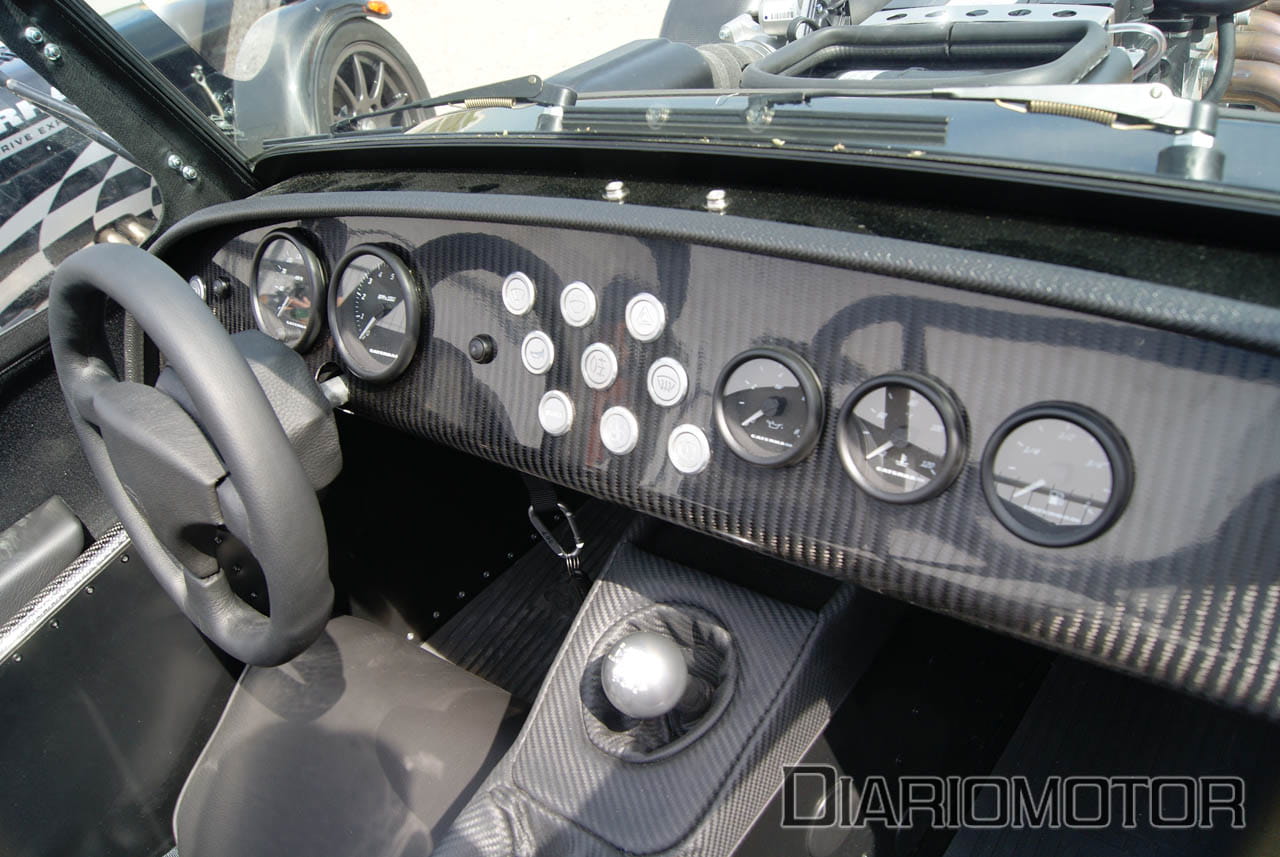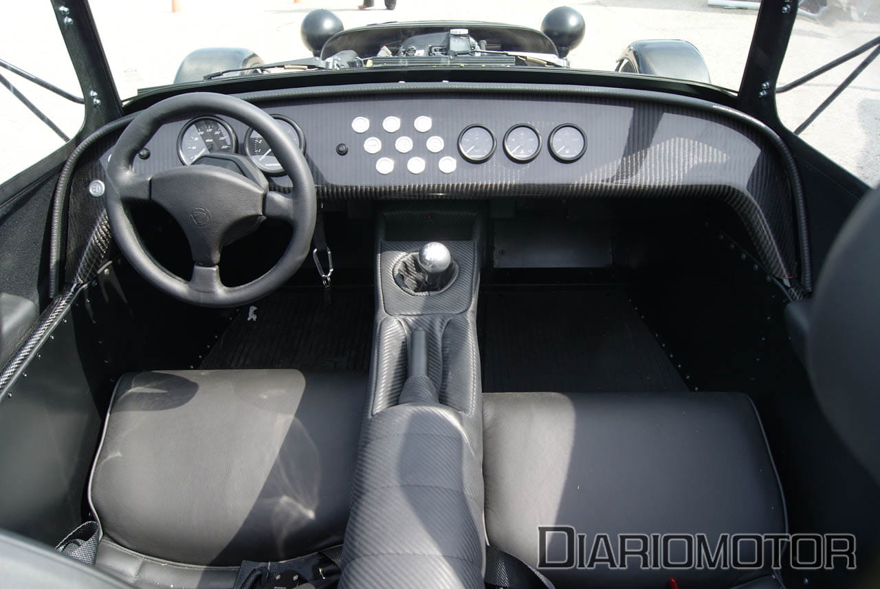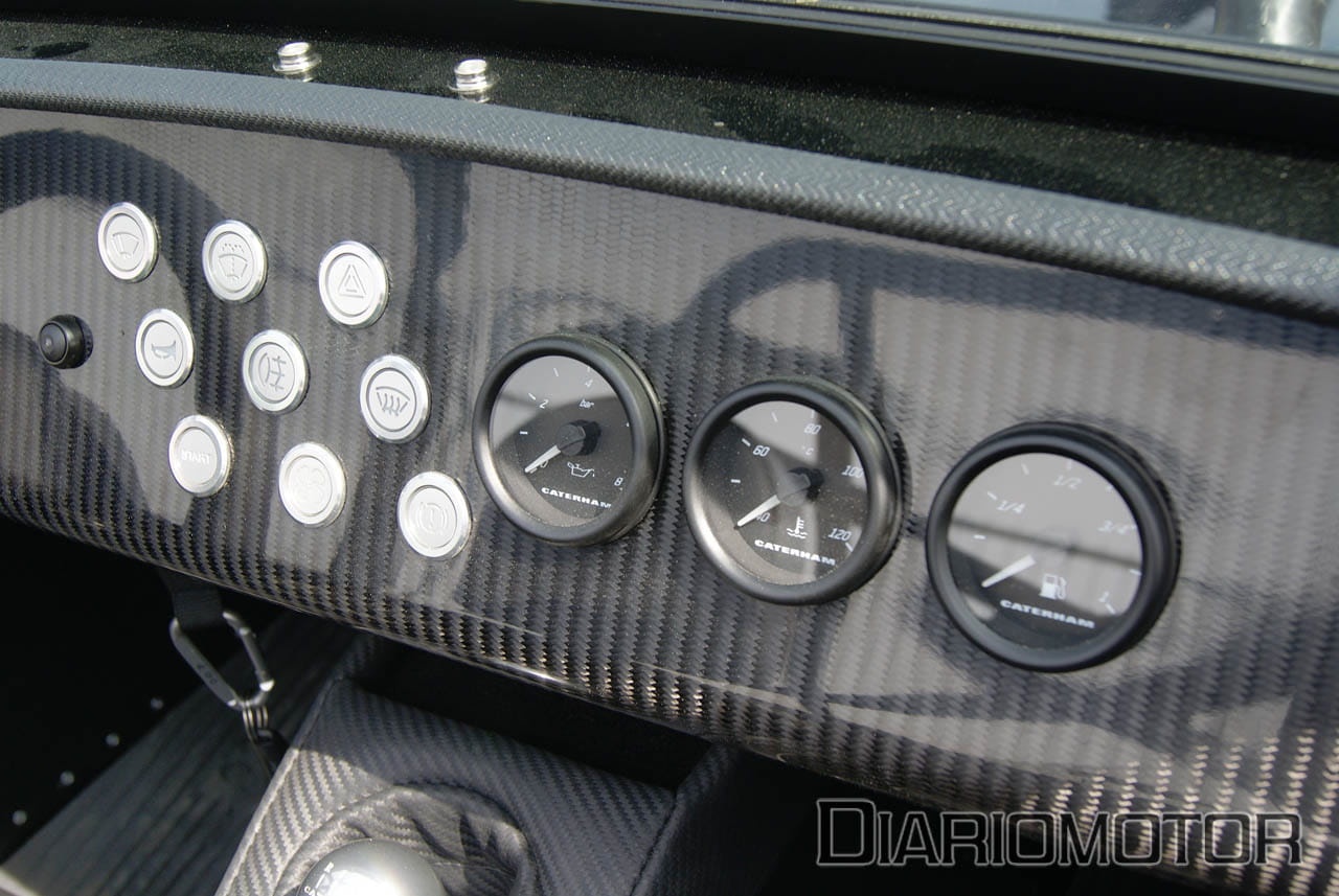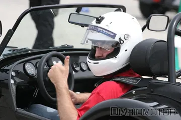 Después del vistazo rápido nos abrochamos el cinturón, un arnés de cuatro puntos para mantenernos bien sujetos al asiento bajo cualquier situación. Lo primero que hago, ya que el coche estaba arrancado, es pisar el embrague y meter primera marcha. La caja de cambios es ultra corta y muy directa, y aunque sólo vamos a usar la primera marcha tiene que ser una delicia subir y bajar marchas con el Caterham. Suelto un poco de embrague y se me cala el coche. Se podría decir que el embrague es digital, no tiene apenas recorrido.