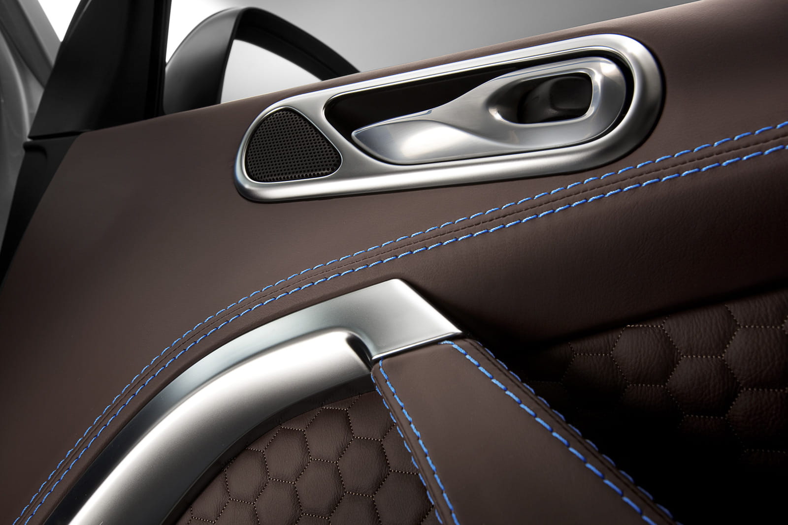 El interior del Aston Martin Cygnet & colette se ha tapizado en cuero color Bitter Chocolate con las costuras en contraste en colette Blue, una mezcla extraña pero que no queda mal del todo. El uso de esos colores viene dado por la propia tienda, ya que son los colores de su mascota (un Labrador) y del logotipo. Otros cambios los vemos en los tiradores de la puerta, de acero inoxidable o en los parasoles, tapizados en Alcántara.