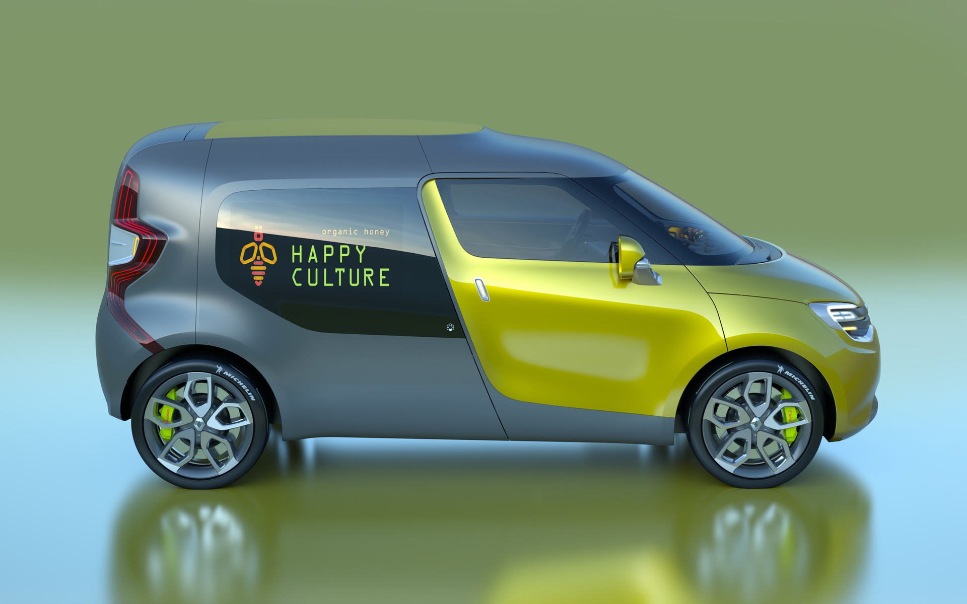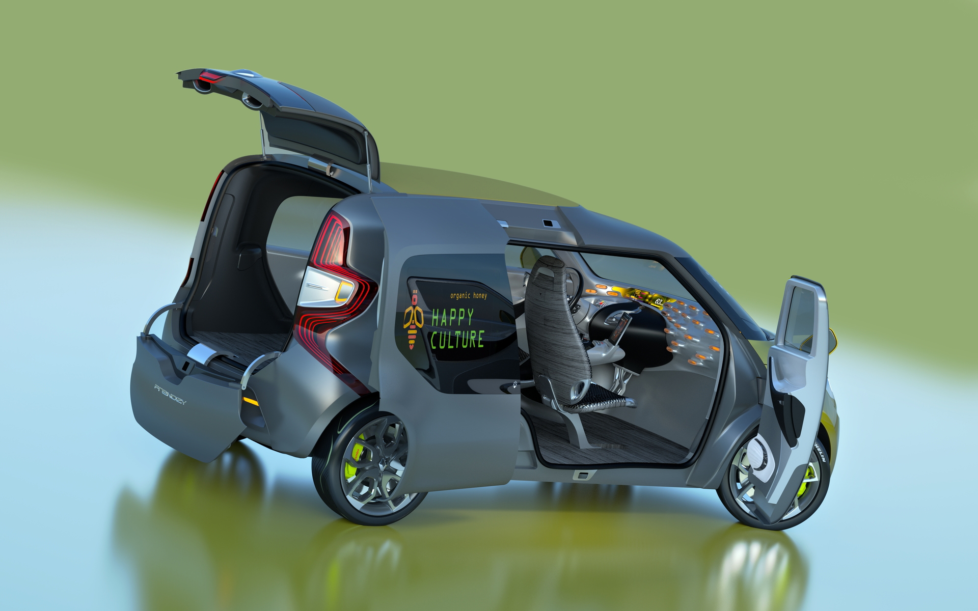 El lateral derecho cuenta con una puerta trasera corredera mientras que el izquierdo cuenta con una puerta trasera de tipo suicida y ausencia de pilar central. Su diseño asimétrico facilita además la instalación de un panel luminoso de 37” en el lateral derecho que mediante un tablet BlackBerry PlayBook permite mostrar mensajes publicitarios o el emblema de la empresa que emplearía el Renault Frendzy Concept para llevar a cabo su trabajo.