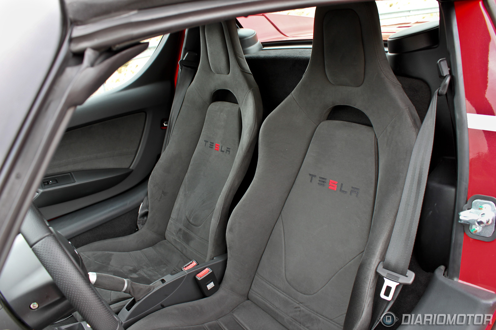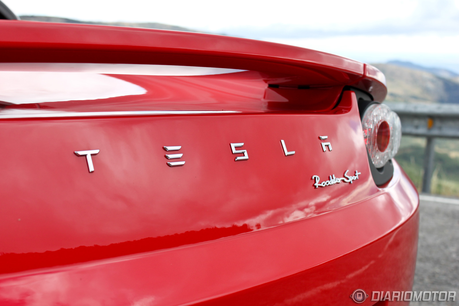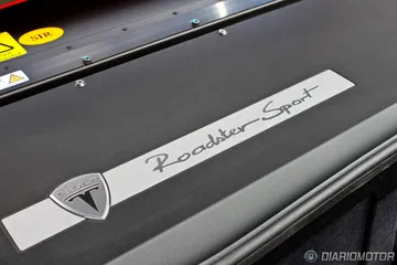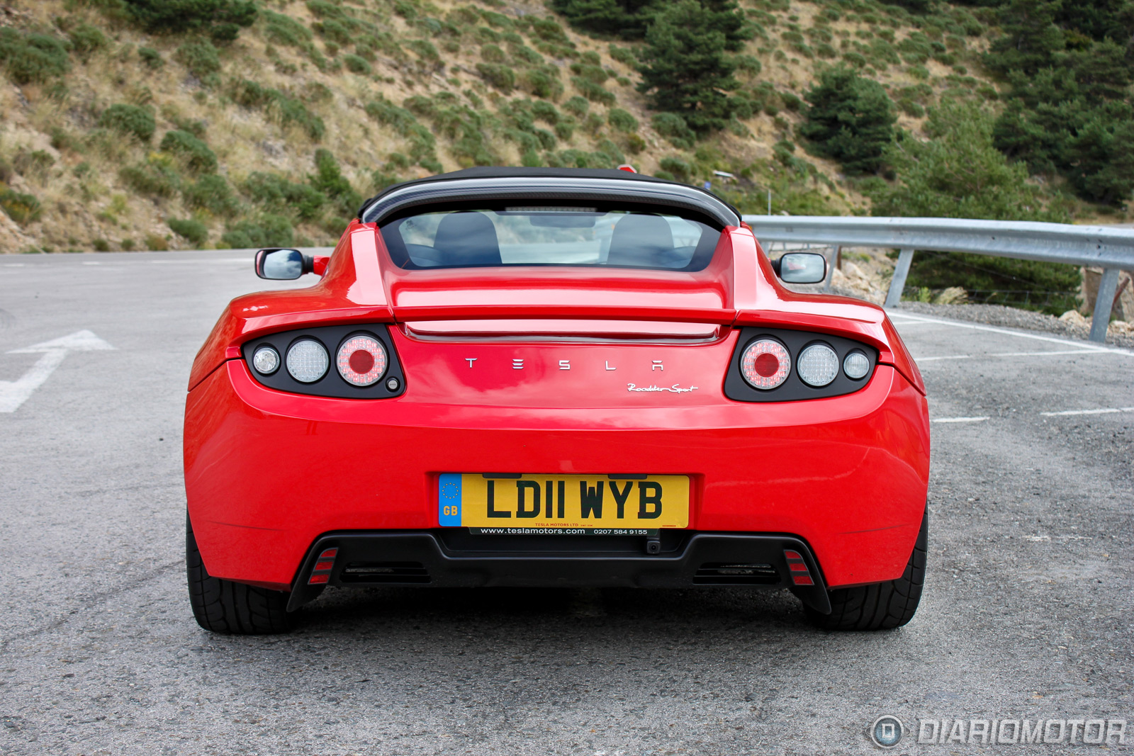 La parte trasera deja a la vista un arco antivuelco de fibra de carbono, y un spoiler perfectamente integrado en las líneas de diseño. Unas ópticas enmarcadas en plástico oscuro nos alumbran con tecnología LED, y a lo ancho del capó trasero se deja ver el logotipo de Tesla Motors y el modelo en cuestión, Roadster Sport. El coche lleva un difusor funcional y como es obvio, carece de los tubos de escape que adornarían cualquier superdeportivo de combustión interna. No los echaremos de menos.