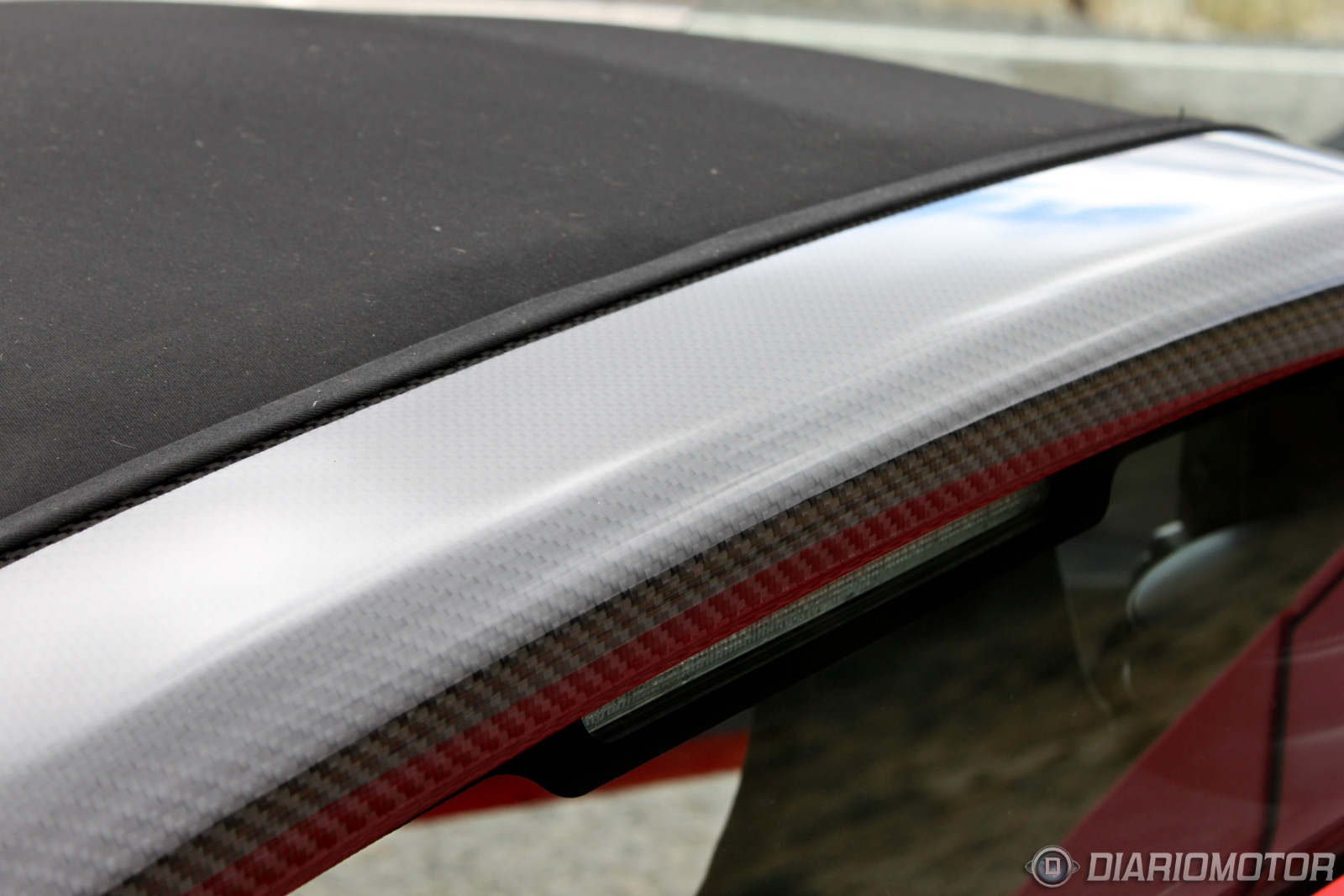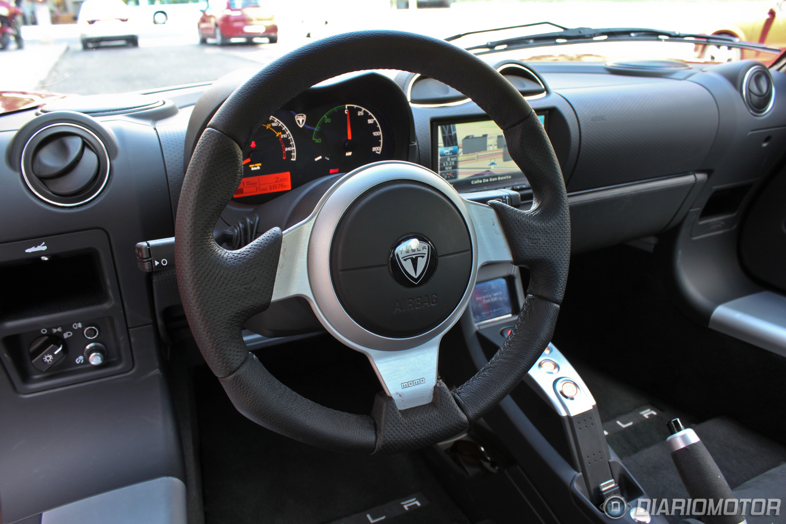 Una vez sentado tengo bastante espacio, mi cabeza va lejos del techo y mis piernas tienen bastante espacio gracias a la forma de la consola central. No nos engañemos, no es un coche para nada amplio y vamos hombro con hombro con nuestro acompañante, pero no resulta angosto o incómodo. El volante sólo es regulable en altura. De marca Momo, es el más pequeño que he agarrado en mi vida, del tamaño de los volantes de videoconsola que usamos para jugar al Gran Turismo.