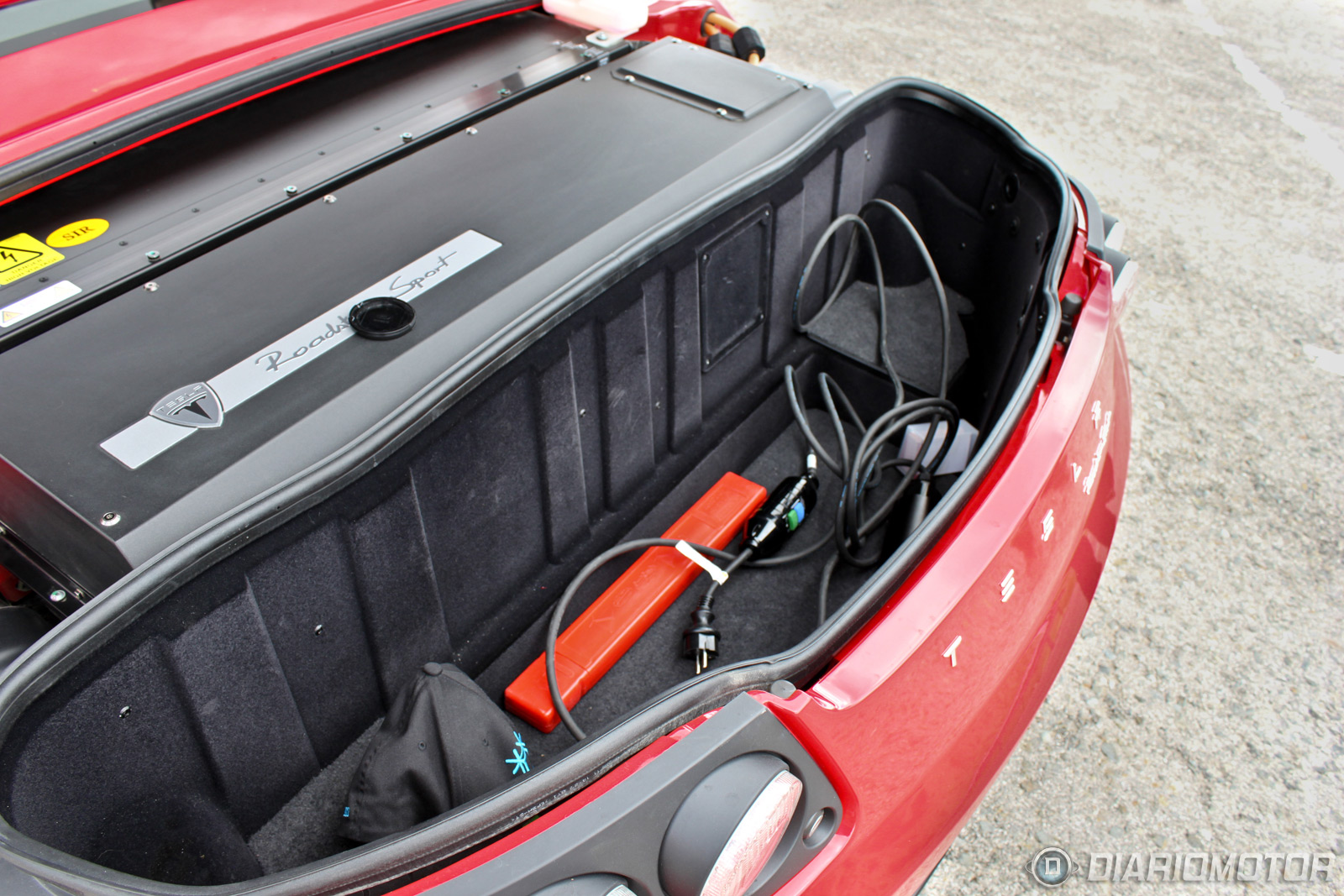 El maletero del Tesla está en el capó trasero, por detrás del pack de baterías. Tendrá unos 150 litros de capacidad, y en el mismo cabe una maleta pequeña, los cargadores y bastante poco más. Hay que levantar los objetos a una altura considerable del suelo y es un maletero relativamente profundo. En un compacto como el Toyota Auris HSD sería preocupante, pero aquí no nos importa lo más mínimo. Ningún dueño va a cargarlo hasta los topes, los viajes serán siempre cortos.