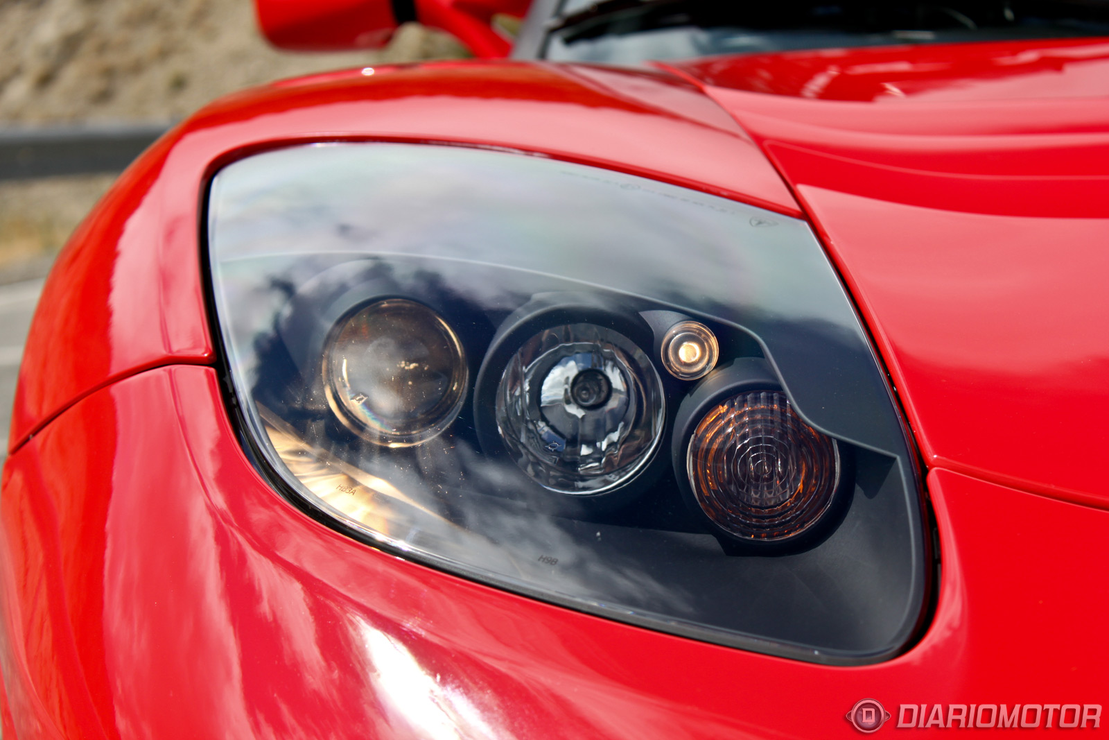 El Tesla Roadster es un coche que llama mucho la atención. Nuestra unidad estaba matriculada en Gran Bretaña, pero tenía el volante a la izquierda y un velocímetro tarado en km/h. Es un coche muy bajito, sólo 1,13 metros de altura. El ADN del Lotus Elise se deja notar en el aspecto general del coche, pero Tesla Motors ha imprimido personalidad propia en su carrocería, construida totalmente en fibra de carbono. Comenzamos por un frontal redondeado y de formas suaves.
