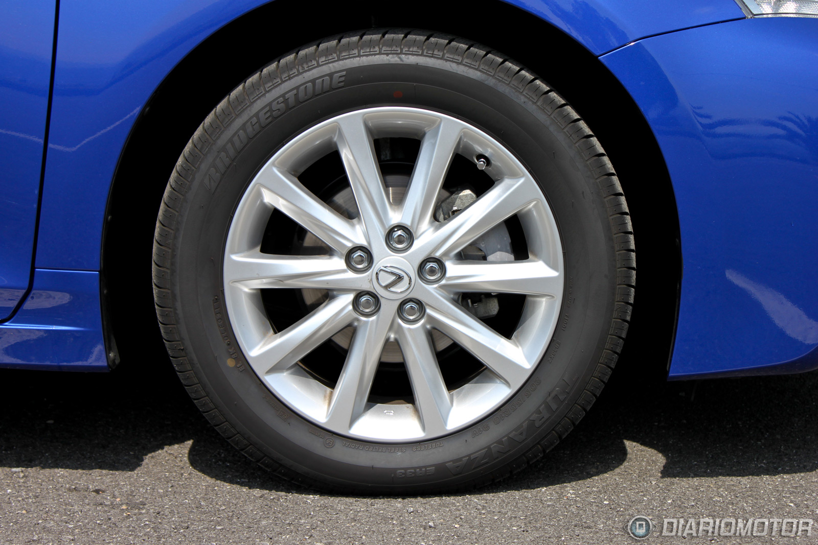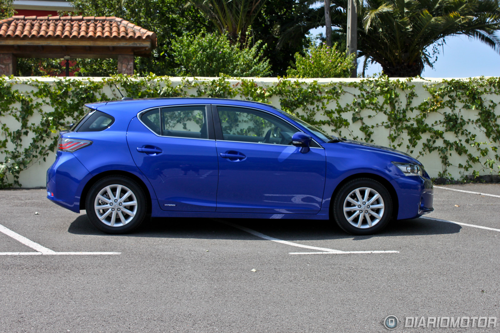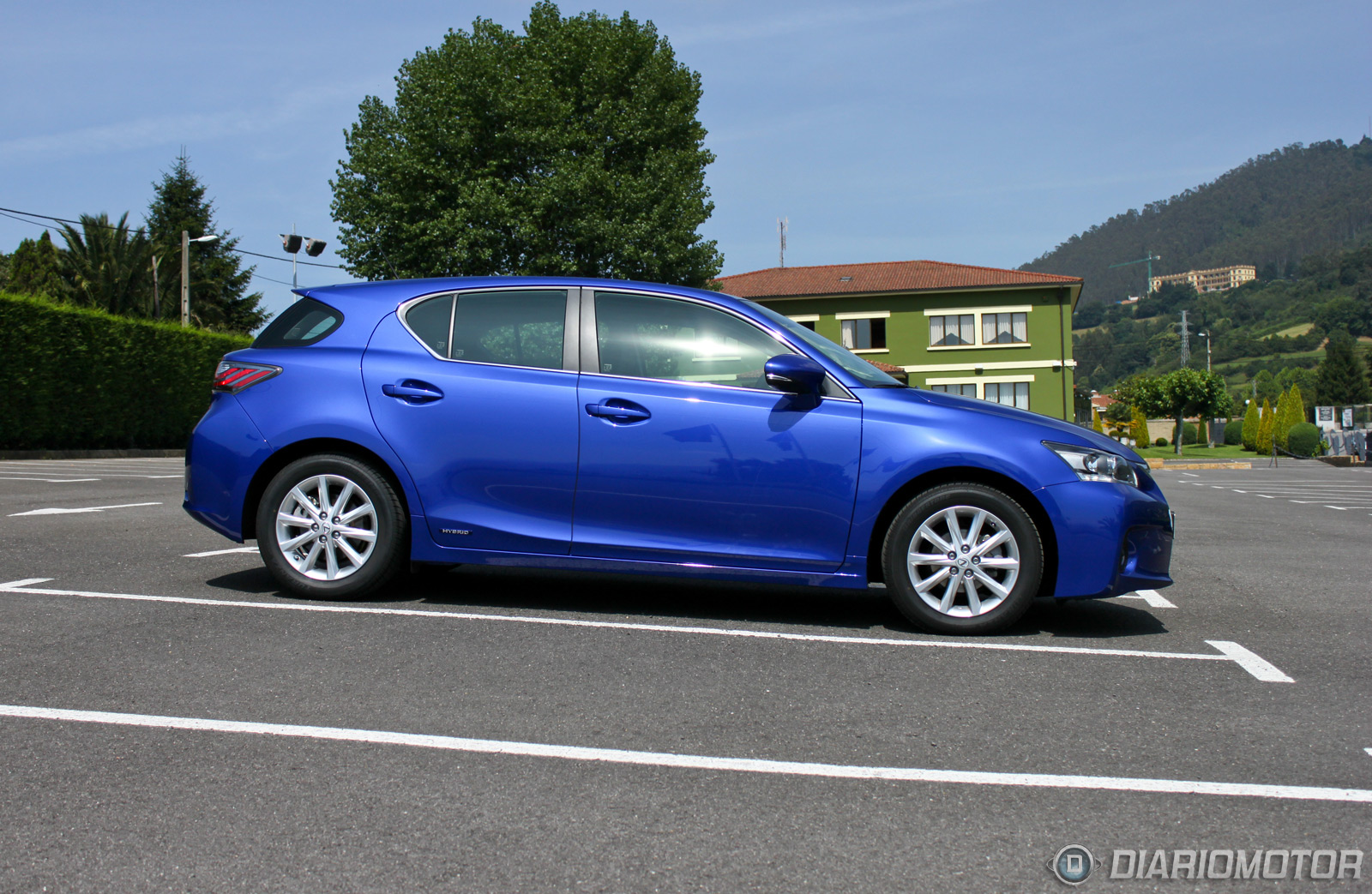 El frontal del Lexus CT 200h presenta un voladizo delantero importante. El perfil lateral es relativamente bajo, los faldones son amplios debido a que es un coche que necesita de una buena aerodinámica, tiene un cX de 0,29. Las llantas de nuestra unidad son de 16 pulgadas, son bonitas, pero estéticamente unas llantas de 17” con menos perfil de neumático son mucho más agraciadas. Un pequeño emblema “Hybrid” aparece en la parte baja de las puertas traseras.