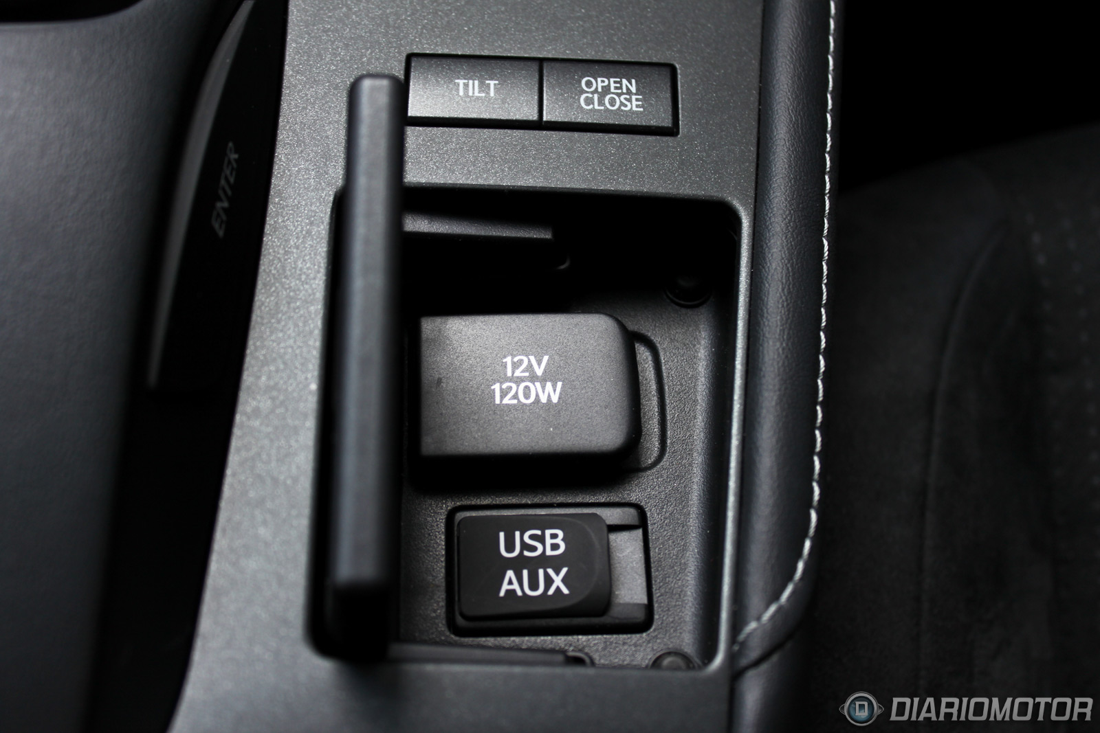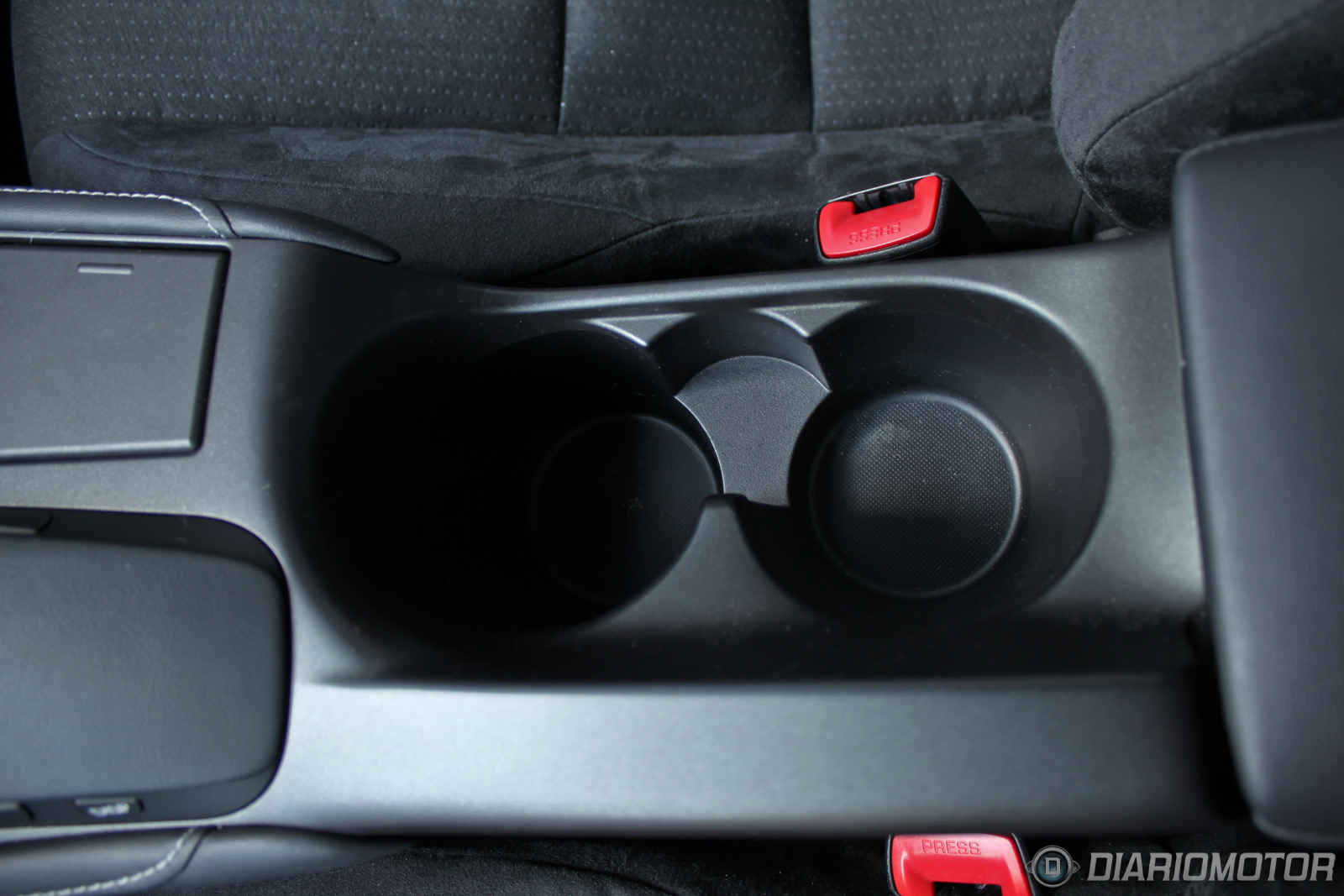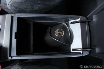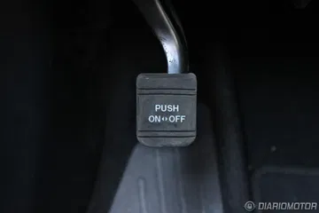 Un botón de arranque azul está situado a la derecha de la instrumentación. Entre los dos asientos no vemos freno de mano alguno, y es porque se acciona de manera mecánica como el pie, cosa que es similar en algunos Mercedes y especialmente vehículos estadounidenses. En cuanto a practicidad, una pequeña tapa en la consola central cubre las tomas auxiliares del equipo de audio y hay dos posavasos entre ambos asientos, además de un compartimento bastante grande bajo el reposabrazos con monedero incorporado.