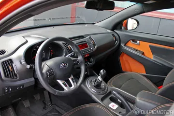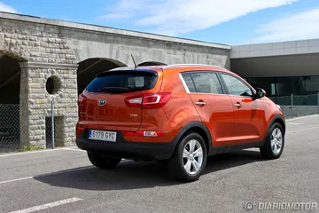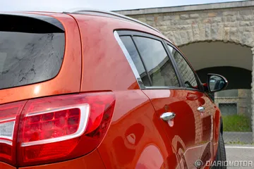 El perfil lateral es anguloso y sus aristas transmiten una sensación de mucha robustez, fuerza. Las llantas de 17 pulgadas son de serie en la versión Drive, así como lo son los detalles cromados, presentes en los tiradores y en el marco de la puerta trasera, cuya curiosa forma permite un acceso fácil al habitáculo. La línea de cintura ascendente y un pilar C muy ancho contribuyen a la imagen masculina y deportiva del Kia Sportage. La línea de cintura atraviesa al coche, desde las ópticas delanteras o las traseras.