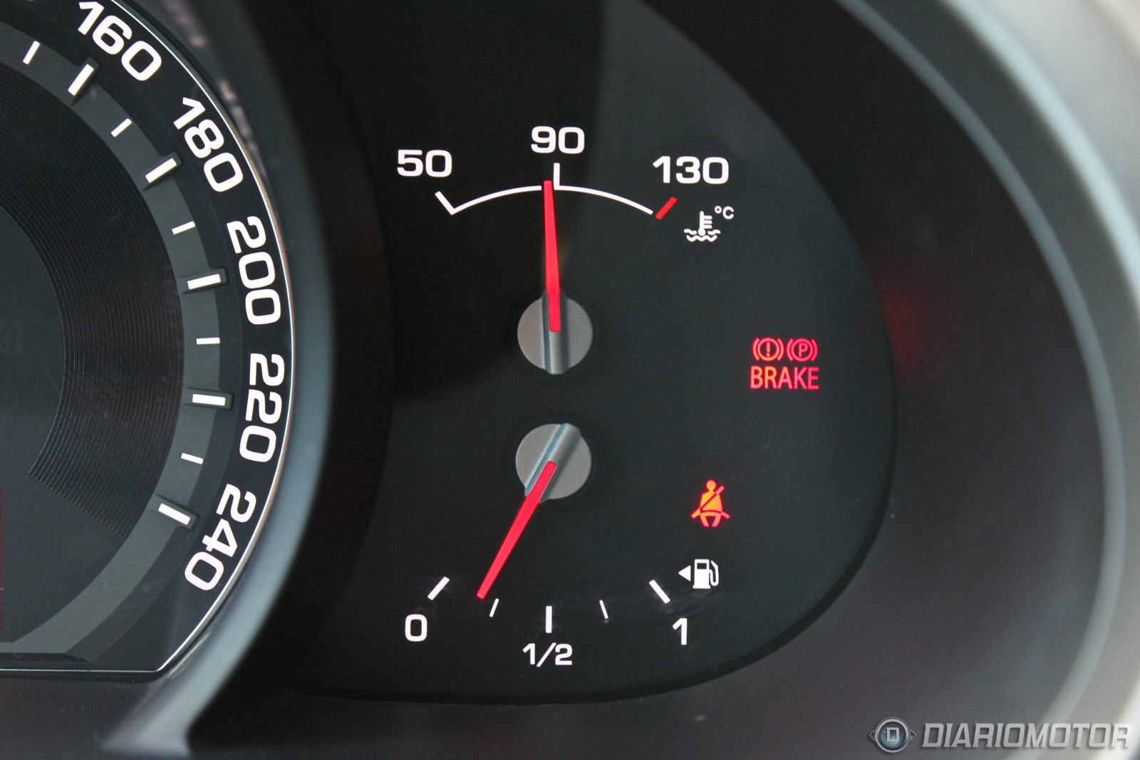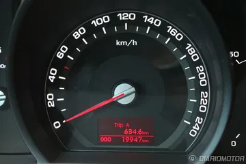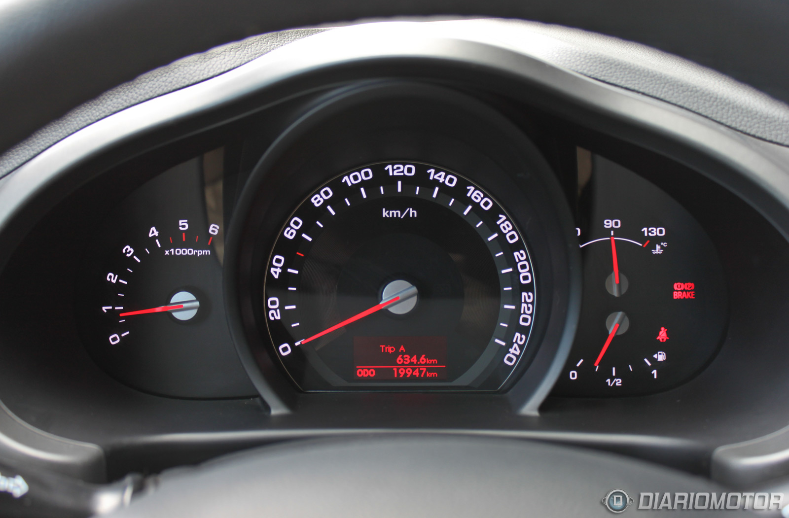 Parte de la pieza del salpicadero es de plástico acolchado de tacto blando y gomoso, mientras que la pieza frontal – donde está el equipo de sonido o la instrumentación – es de un plástico duro bien ajustado. Hay remates satinados en la zona del climatizador. La calidad de construcción es buena, algo comprobado al no existir ni un sólo grillo al pasar por zonas bacheadas o asfalto en mal estado. A la vista lo primero que tenemos es la instrumentación, retroiluminada incluso de día y con un enorme velocímetro central.