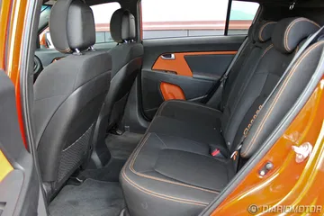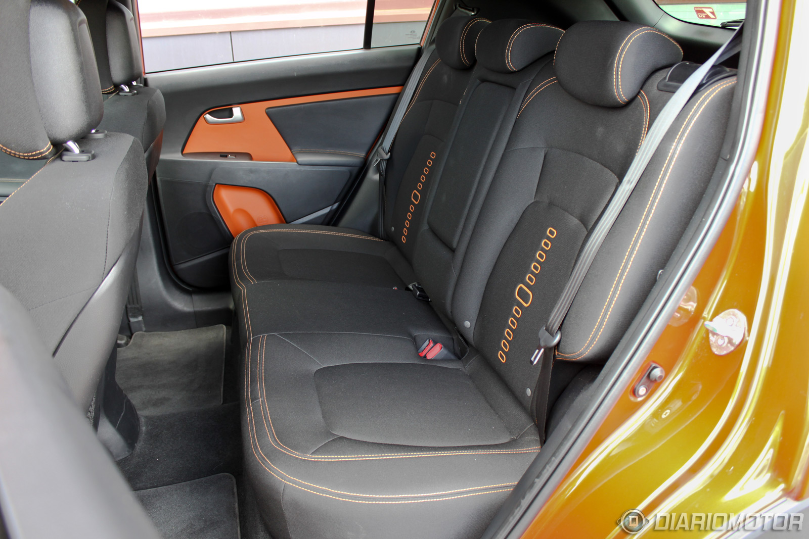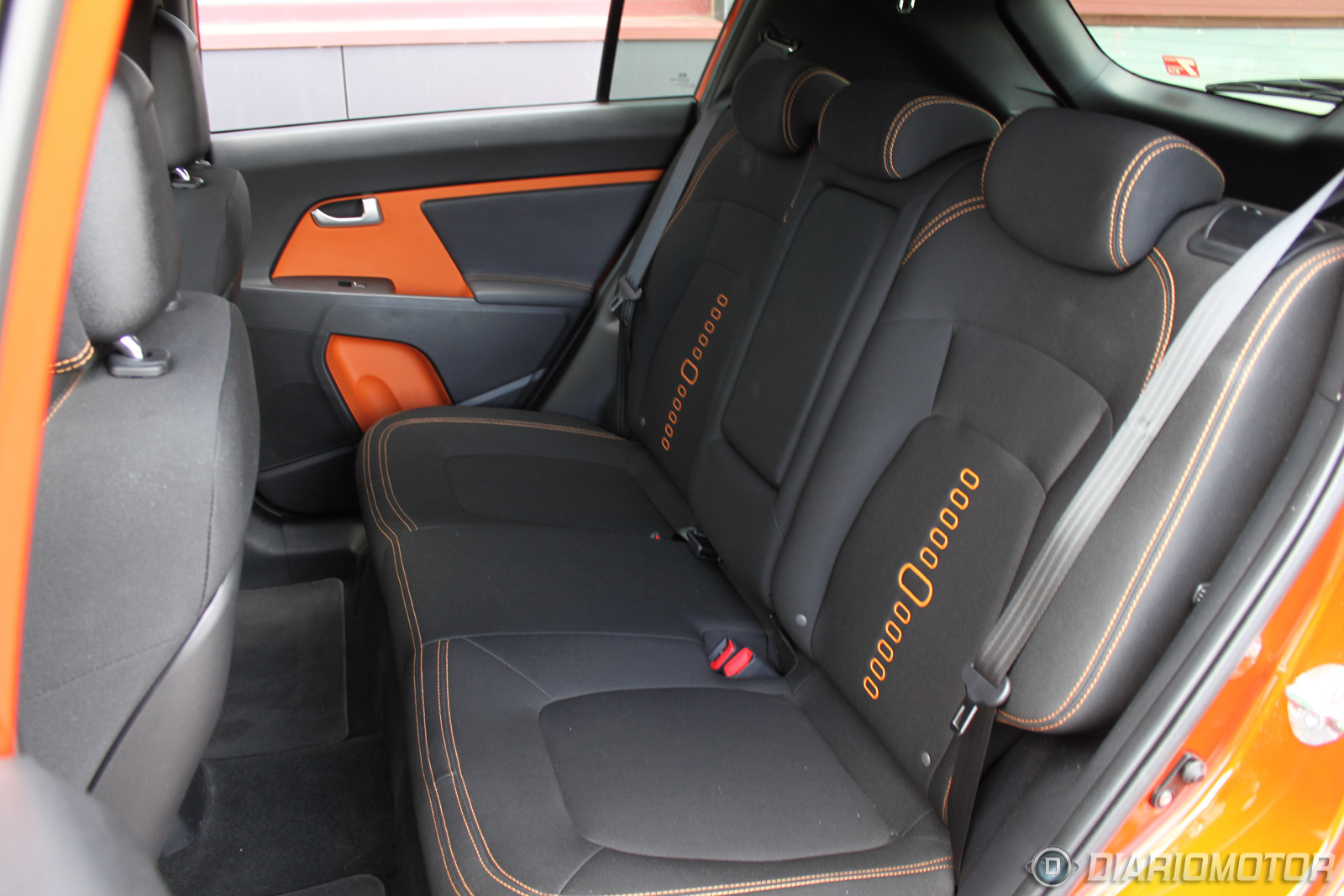 Del Kia Sportage destacamos que las plazas traseras tienen un tamaño muy generoso para adultos incluso de talla alta. Sentado en uno de los asientos mi cabeza tiene un palmo hasta el techo y mis rodillas quedan lejos del asiento delantero. Uno de los detalles más interesantes del coche es que tres pasajeros no van a ir demasiado apretados y el piso de estas plazas es completamente plano, sin túneles centrales o huecos portaobjetos que nos molesten. La parte trasera de los asientos delanteros es de plástico duro.
