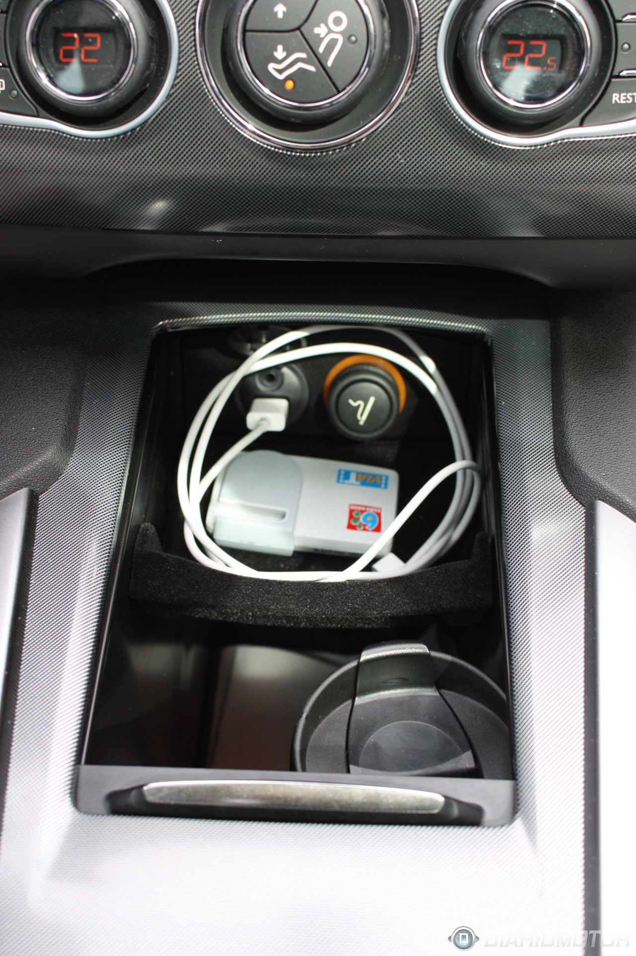 Tiene un hueco muy grande en el túnel de la consola, que a su vez tiene un pequeño receptáculo que se abre y se cierra (y está tapizado en una moqueta bastante agradable), y a su vez tiene una tapa que permite cerrarlo y poner otras cosas encima de ella.