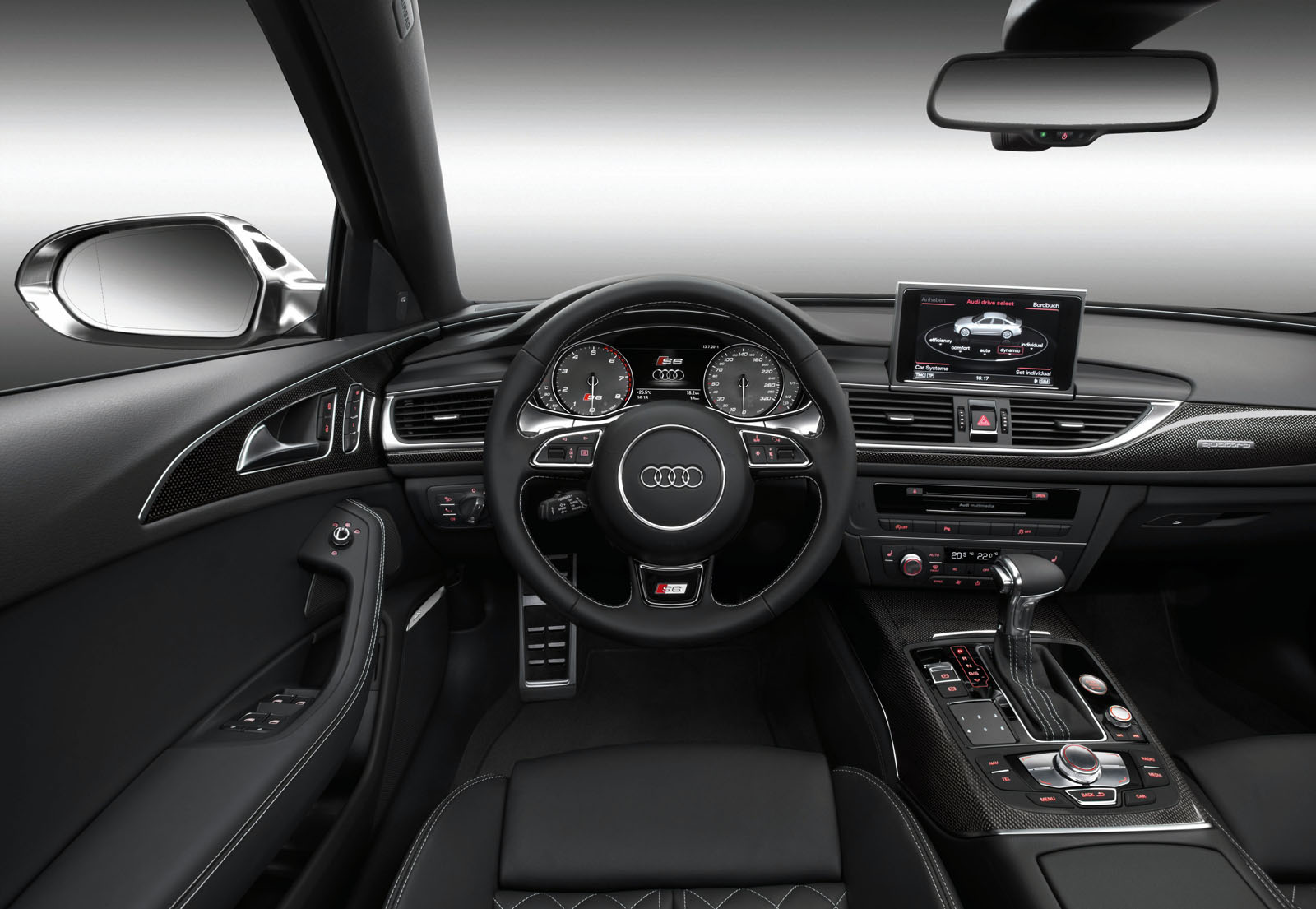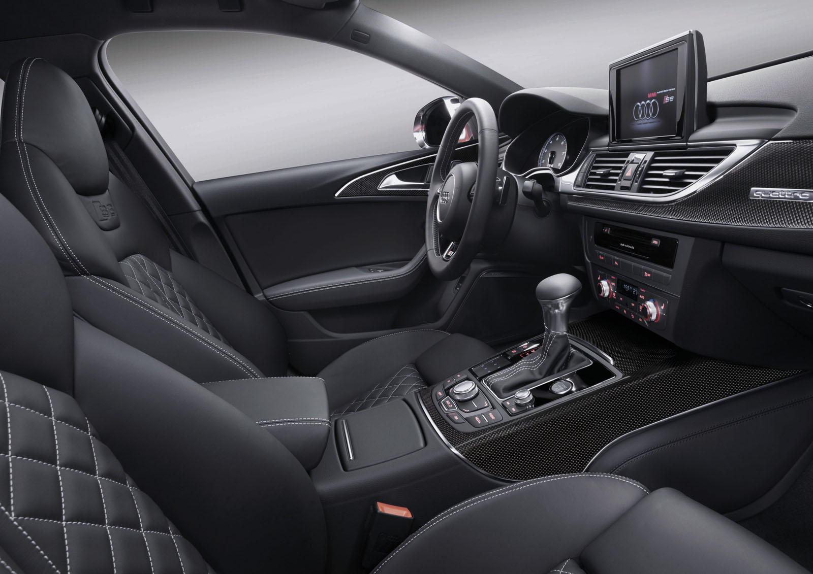 Una vez más tenemos que destacar la excelente presencia del interior de los Audi, acentuada en este caso por los detalles “S” que incorpora el Audi S6. La distribución de mandos e instrumentación es obviamente la misma que en el A6, pero encontramos varios detalles diferenciadores. Se incorporan nuevos asientos de corte deportivo en cuero/Alcantara con reglajes eléctricos y el logotipo S grabado, un nuevo volante deportivo de cuero con levas de cambio en aluminio, numerosas inserciones en aluminio, etc…