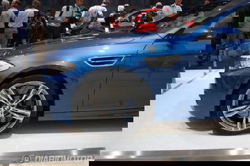 Sobre el suelo, dos unidades del BMW M5, una blanco y otra en azul, precisamente los colores de la bandera de Baviera y que estan presentes en el logo de la marca ¿casualidad o marketing?. Las modificaciones exteriores respecto a un Serie 5 normal son evidentes. Principalmente, afectan al faldón delantero – sin faros antiniebla – y trasero – con difusor entre las dobles salidas de escape- y unas branquias ya caracteristicas con la serigrafia M5. Un discretisimo spoiler en la tapa del maletero remata la zaga del coche.