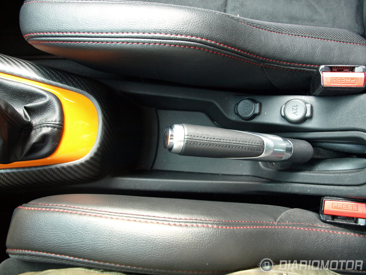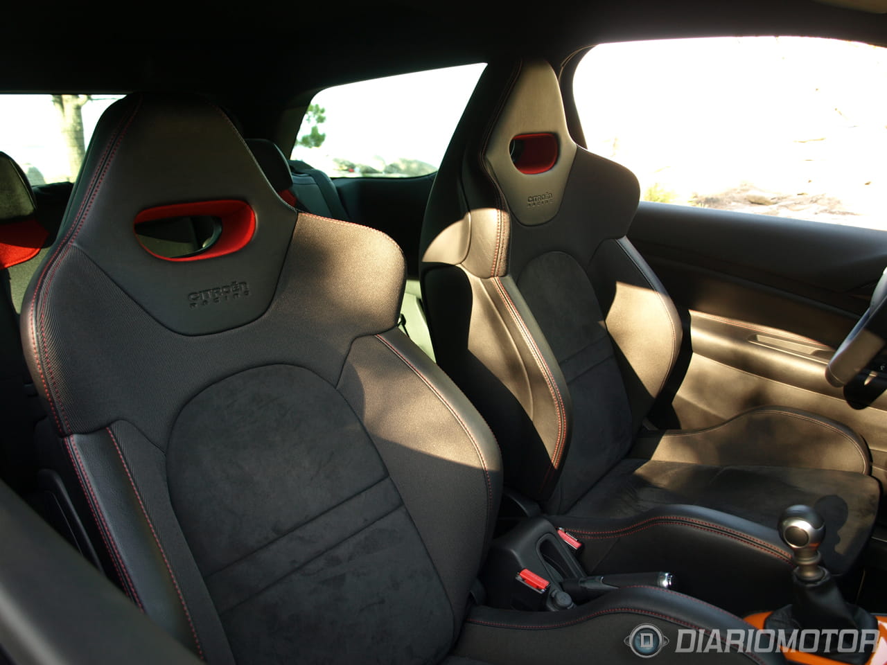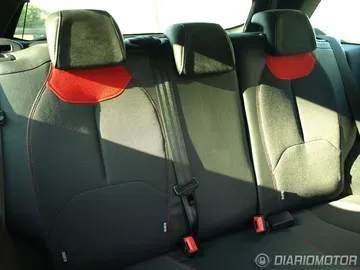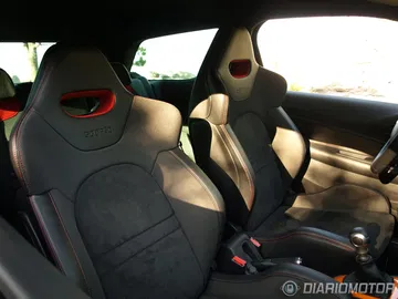 Los asientos llevan Alcantara, un lujo impropio de un coche de este tamaño, y con una forma a medio camino entre la butaca de competición y los típicos asientos de coche pequeño. En la fila trasera no hay “baquets” pero sí asientos diferenciados, con reposacabezas en Alcantara y costuras en color naranja en común con los delanteros. Sin duda de todos los participantes de este balín naranja el conductor es el más agraciado.