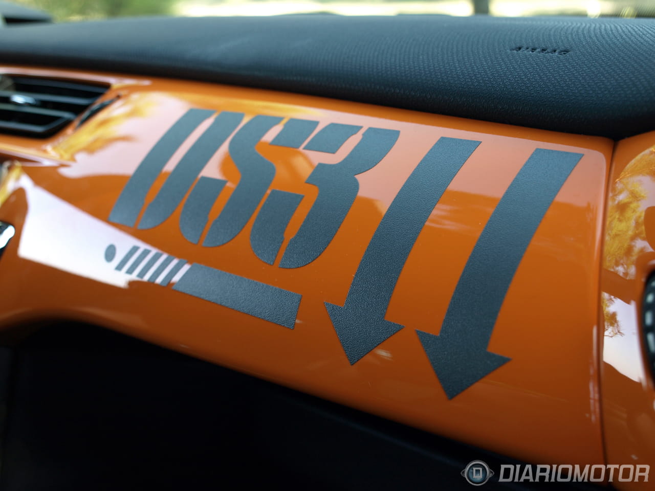 Al pasar por núcleos urbanos la gente se giraba para ver el coche como si de un Porsche o un Ferrari se tratase. Hay muchas formas de llamar la atención y el DS3 Racing lo consigue por el sonido que expulsa su escape pero, sobre todo, por los colores y los detalles que se gasta. El DS3 Racing es de color negro, en el fondo, y cuenta con el techo, los retrovisores, las llantas de 18” o la calandra pintadas de color naranja. Difícil sacarse de la cabeza estas llantas de huecos poco geométricos que brillan en color anaranjado, algo poco visto salvo en superdeportivos como los de Sant’Agata Bolognese. El extra final lo marcan las etiquetas en marrón pulido que incluso marcan “Caution” al lado del depósito. No estaría bien repostar gasóleo, sacrilegio.
